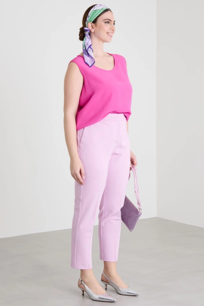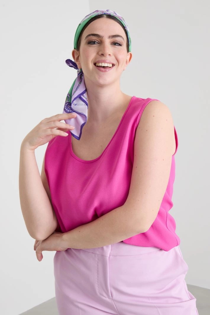 Straight-cut sleeveless top in viscose blend envers satin, with round neckline.