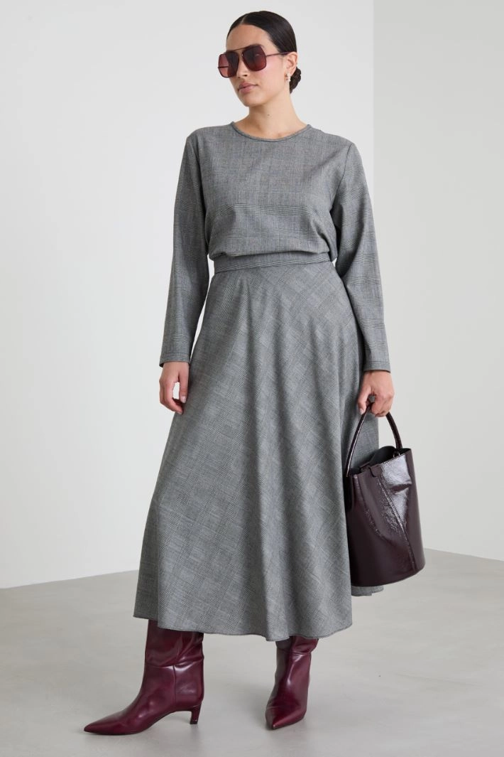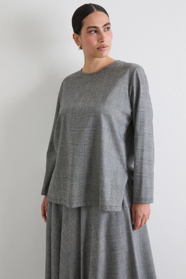 Straight-cut blouse in yarn-dyed stretch wool batavia, with round neckline, long sleeves and side slits. Button fastening on the back.