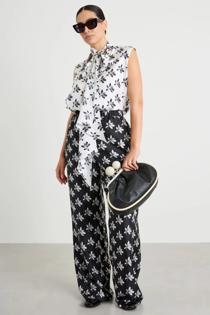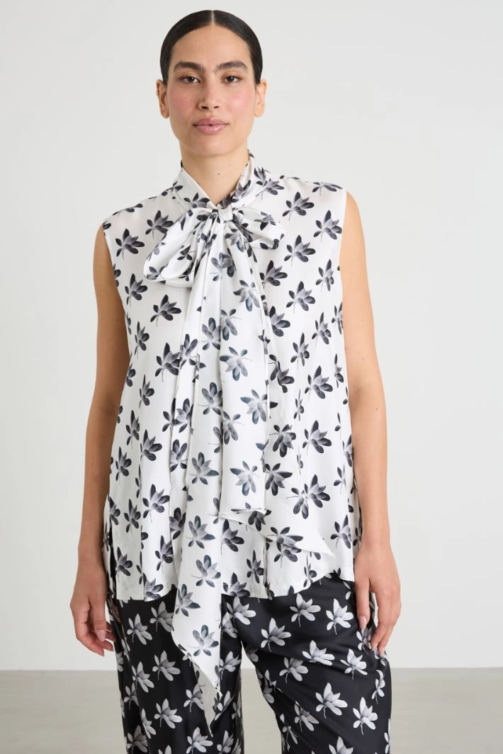 Straight-cut blouse in pure silk twill, with a Mandarin collar and side slits at hem. Concealed fastening with buttons.