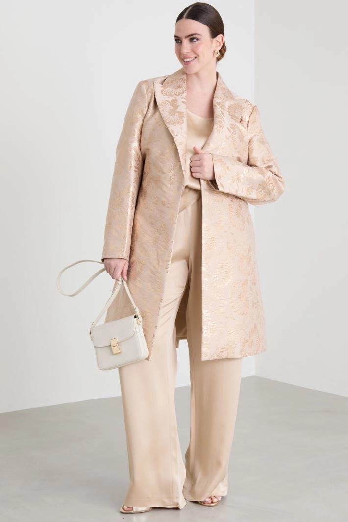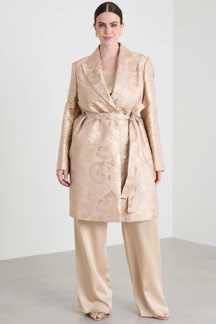 Straight-fit overcoat in jacquard lamé fabric, with peak lapel collar, long sleeves, inset side pockets and central slit in the back. Fastening with a matching belt. Lined.