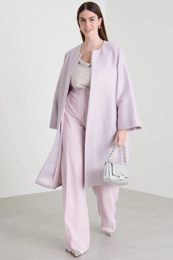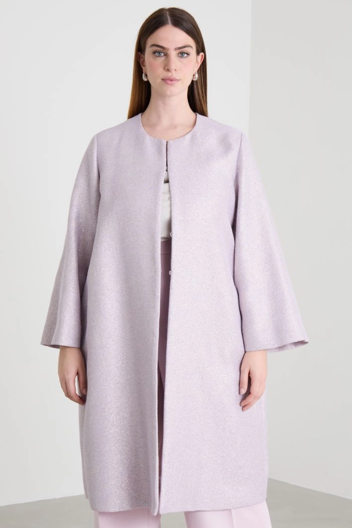 Straight-fit duster in yarn-dyed cotton blend lamé fabric, with rounded neckline, long sleeves and inset side pockets. Hidden fastening with hooks. Lined.