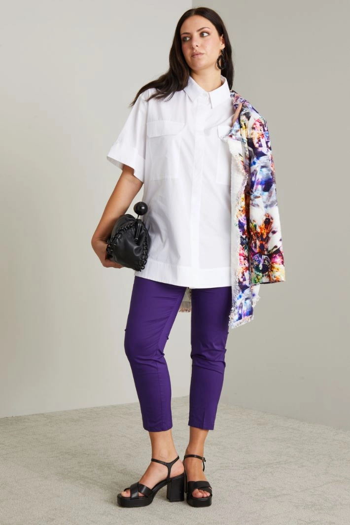 Slim-fit trousers in cotton poplin, with elastic waistband. Zip and button fastening.