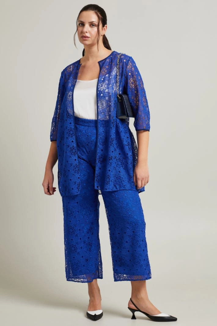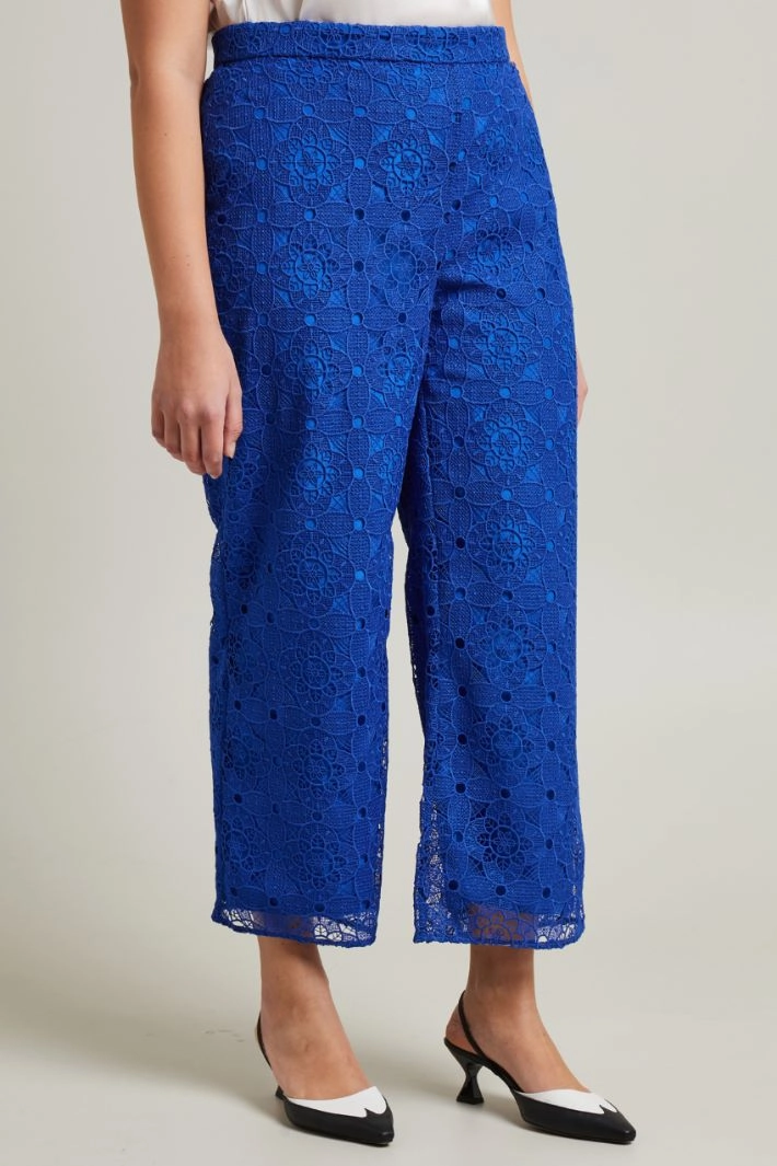 Macramé lace Palazzo trousers with waistband. Side zip fastening.