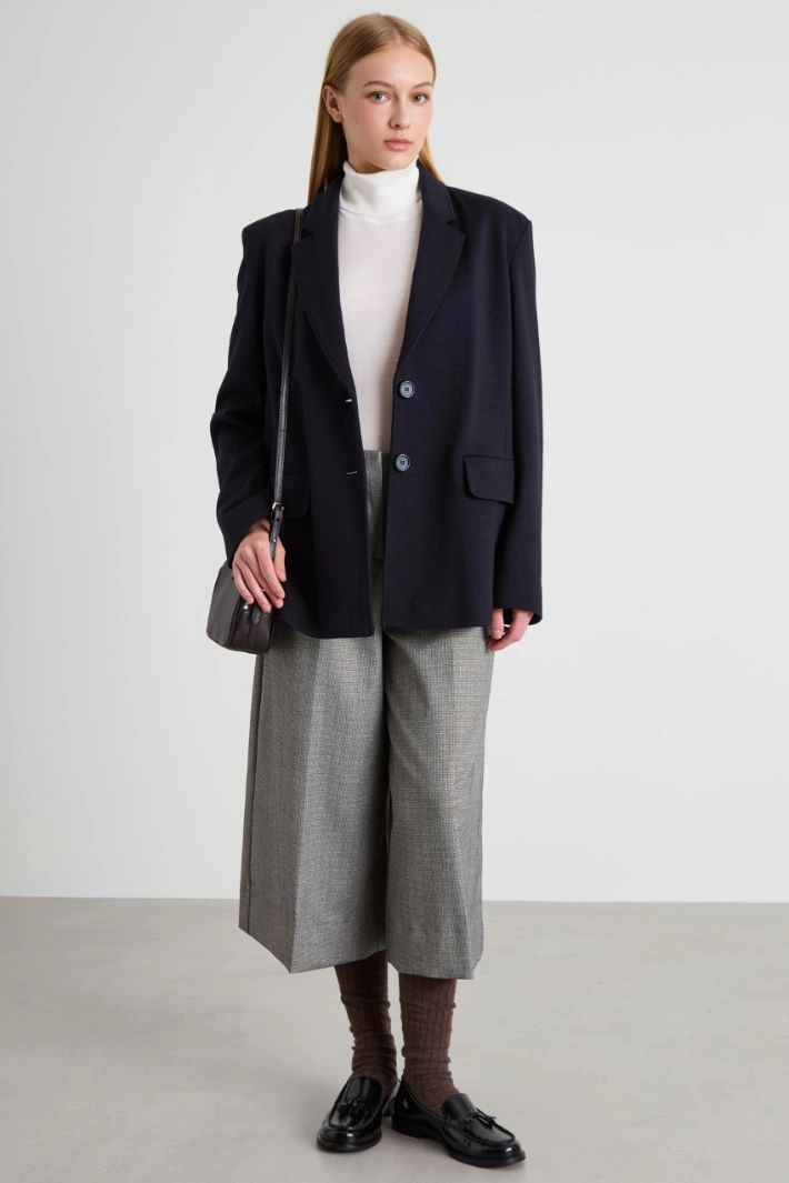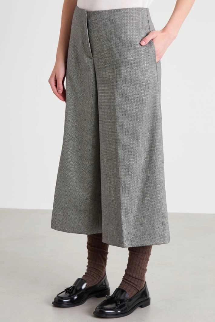 Loose fit cropped trousers in yarn-dyed stretch viscose blend fabric, with lamé fibre insert, side pockets and welt pockets on the back, and crease ironed lengthwise. Hidden fastening with zip, button and hook.