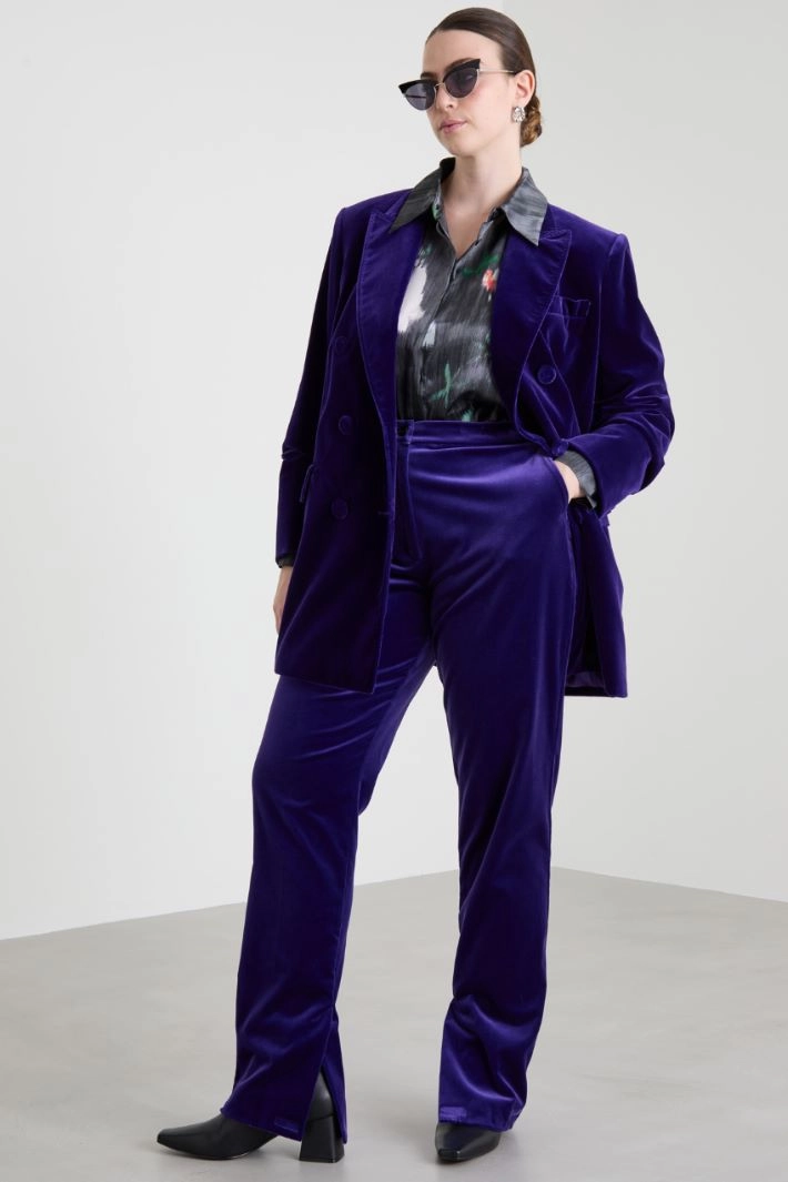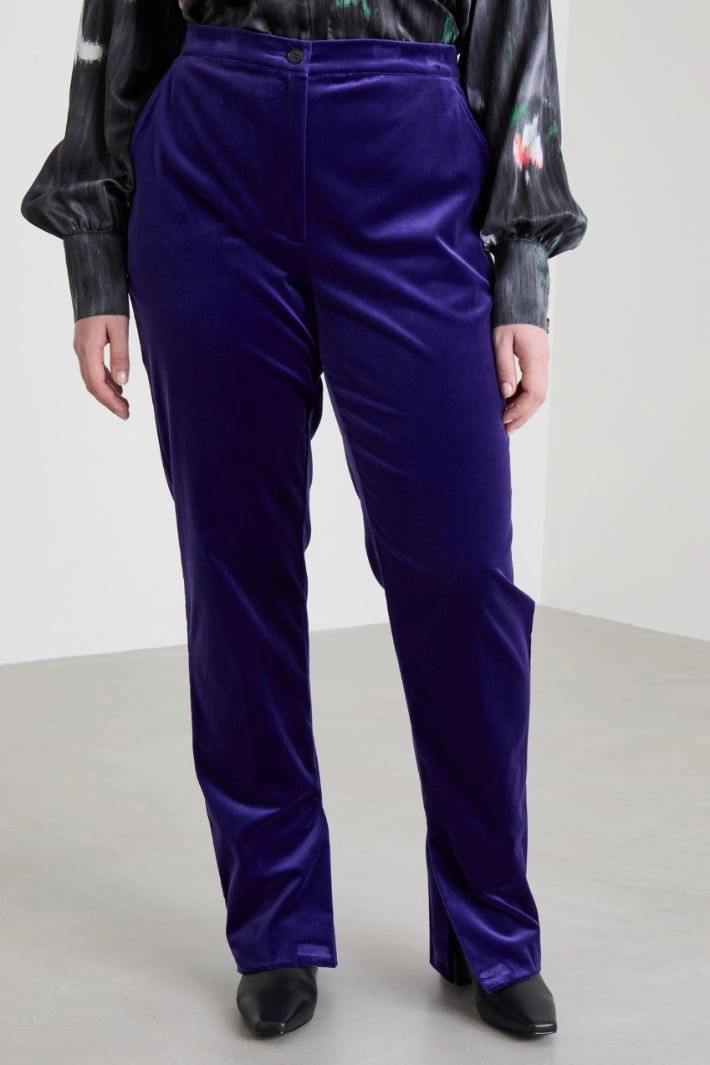 Straight-cut trousers in stretch cotton velvet, with matching dot trim, French side pockets and slits at the bottom. Fastening with hidden zip and button.