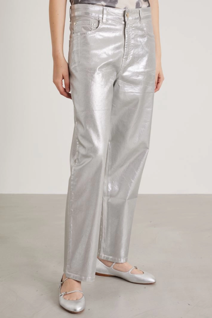 Boyfriend trousers in stretch cotton drill coated with a laminated finish, with belt loops and five pockets. Fastening with zip and metal button.