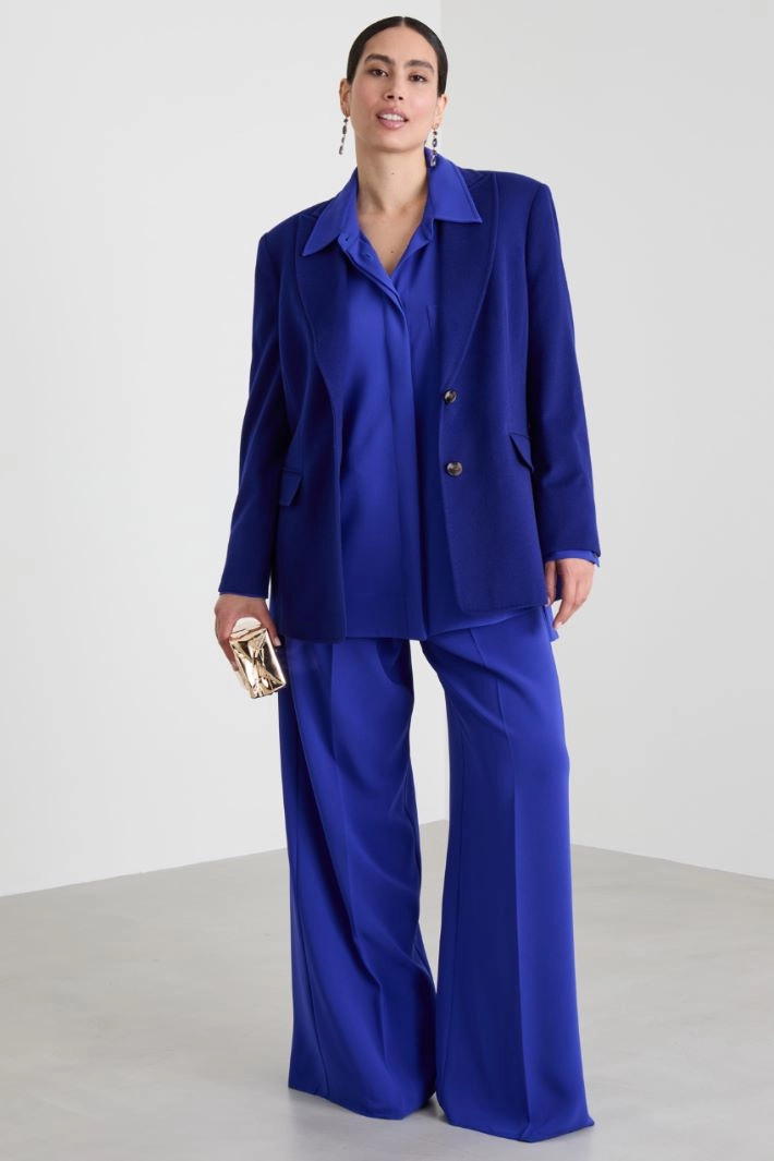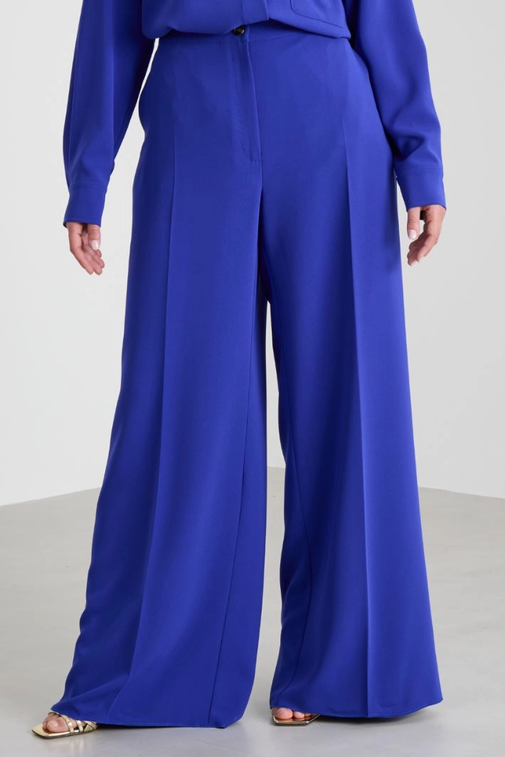 Cady palazzo trousers with sartorial finish, French side pockets and pressed crease. Fastening with hidden zip and button.