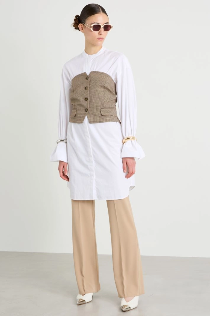 Fitted bustier top in stretch viscose blend fabric, with off-the-shoulder neckline, fake double-welt pockets with flap on the sides and elastic insert on the back. Fastening with visible buttons. Lined.