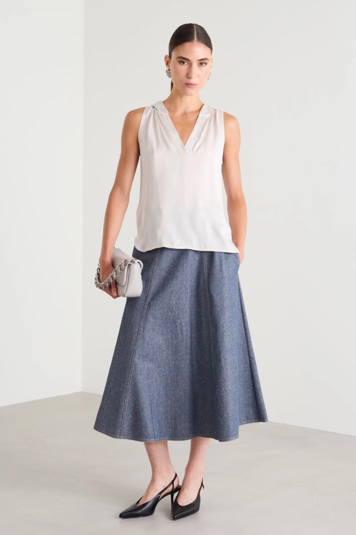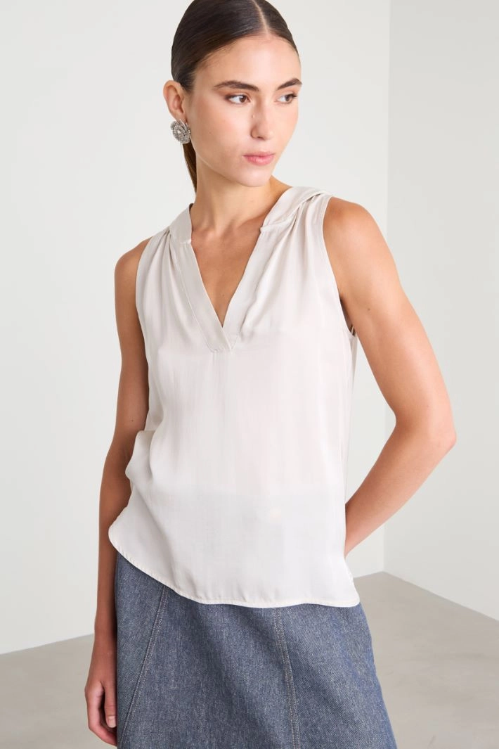 Flowing sleeveless top in pure viscose satin, with hood and V-neck.
