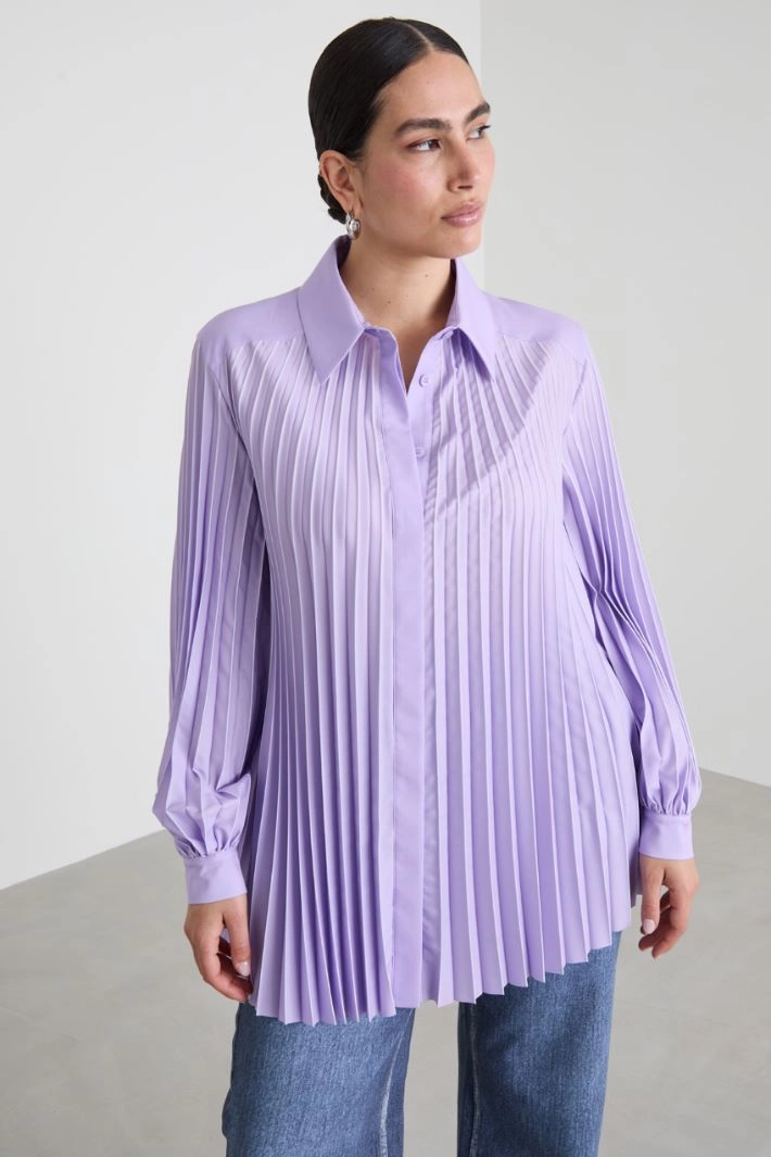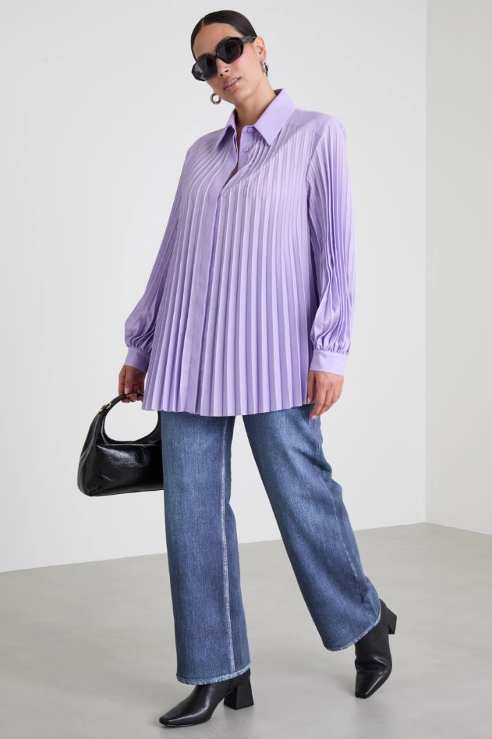 Flowing shirt in crepe de chine, with pleated detail, classic collar, long sleeves with cuff and button and hidden button fastening.