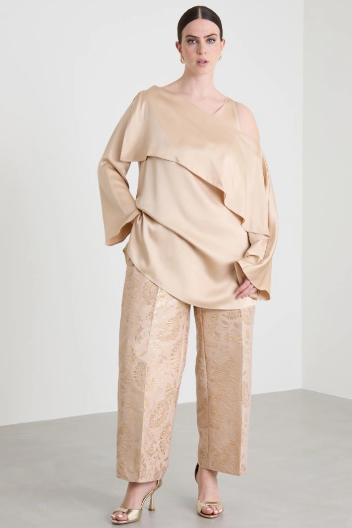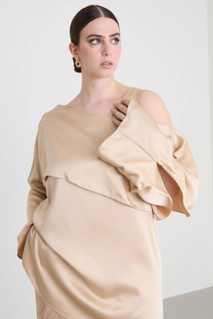 Asymmetrical tunic in viscose blend envers satin with a shiny finish, with shoulder cover sewn onto the shoulder and long sleeves.