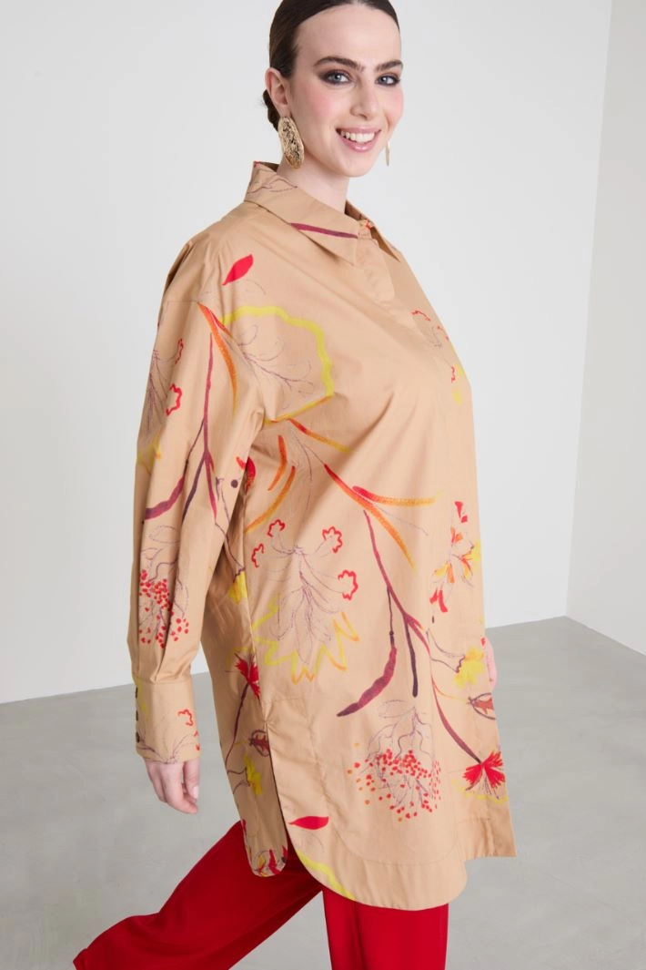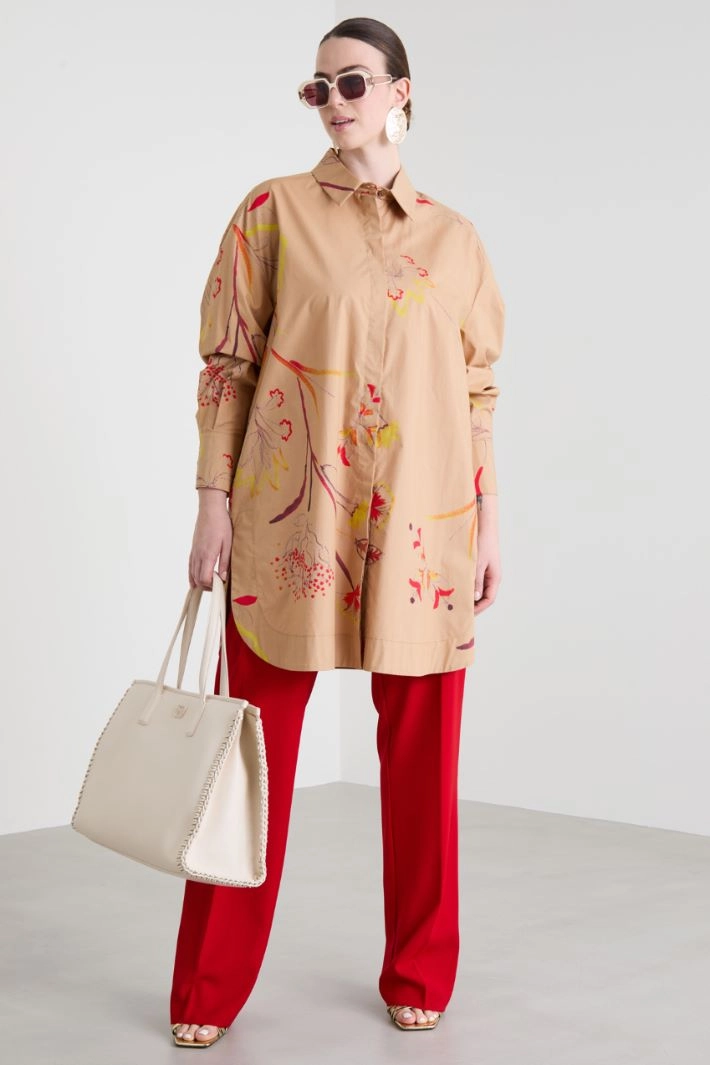 Long straight-cut shirt in printed pure cotton poplin, with classic collar, long sleeves with cuffs and buttons, side slits and hidden button fastening.