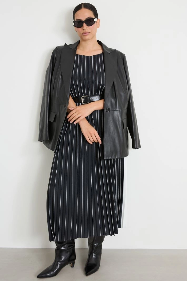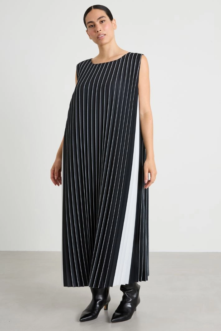 Flared dress in crepe de chine, with pleated detail and boat neckline. Lined.
