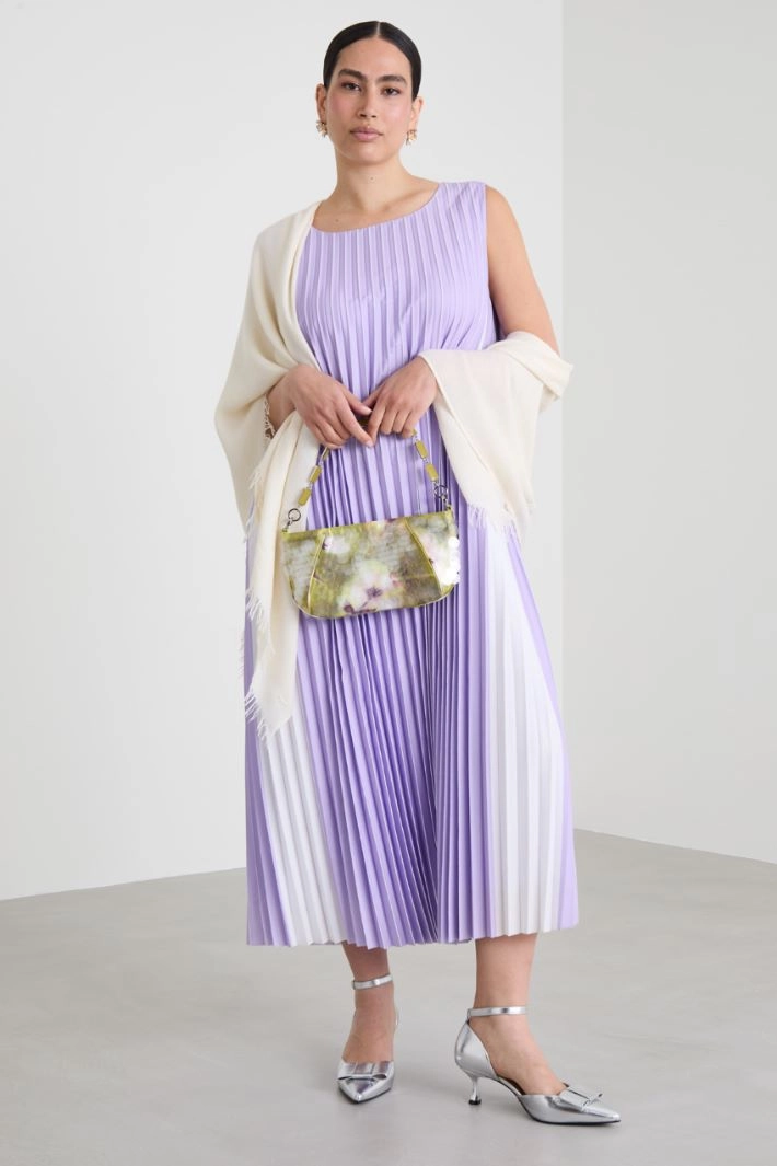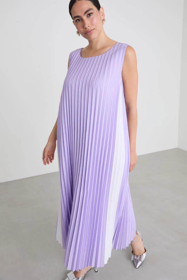 Flared dress in crepe de chine, with pleated detail and boat neckline. Lined.