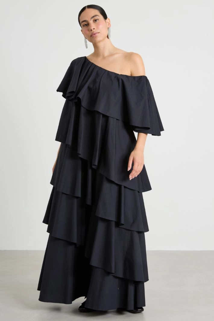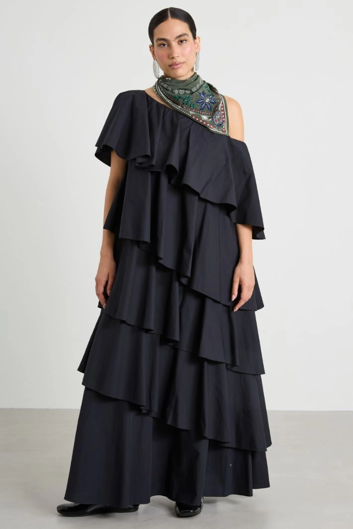 Loose-fit dress in pure cotton poplin, with flounced motif, asymmetrical neckline, short sleeves and inset side pockets.