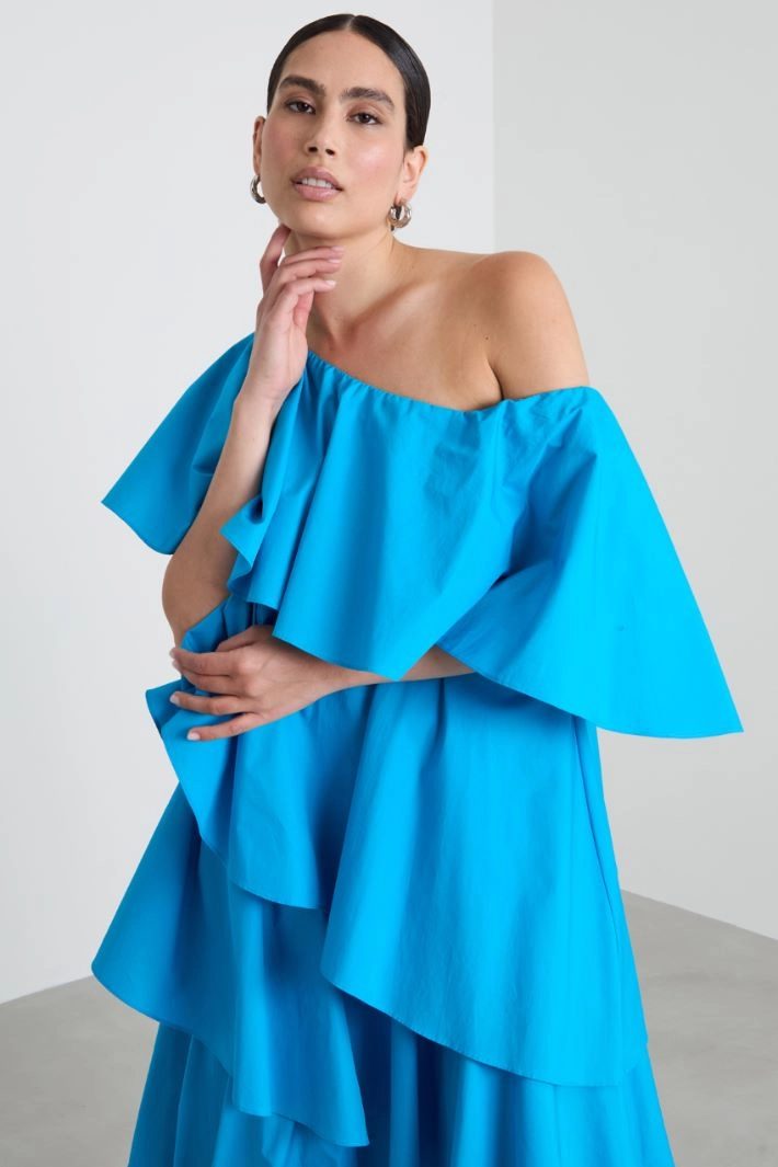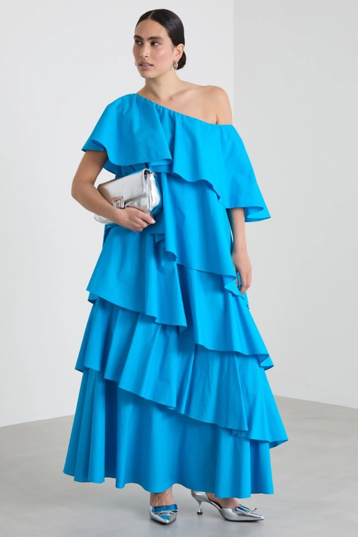 Loose-fit dress in pure cotton poplin, with flounced motif, asymmetrical neckline, short sleeves and inset side pockets.