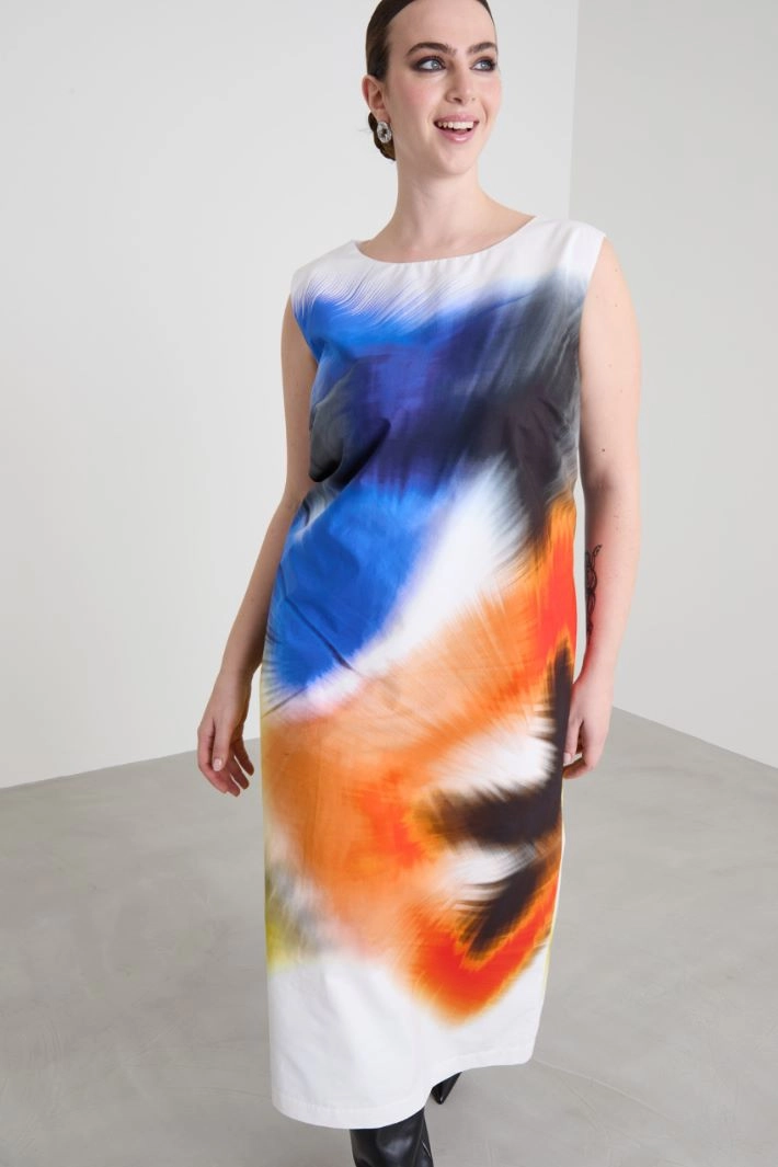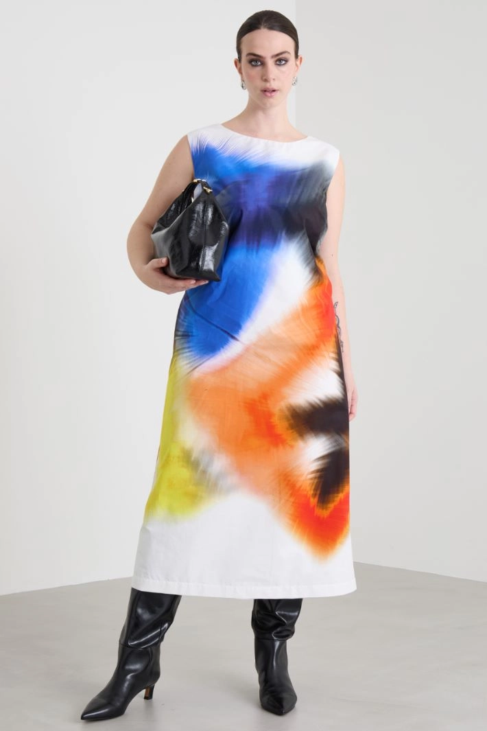 Straight-fit dress in printed pure cotton poplin, with round neckline, sleeveless, side French pockets and central slit. Invisible zip fastening on the back. Lined.