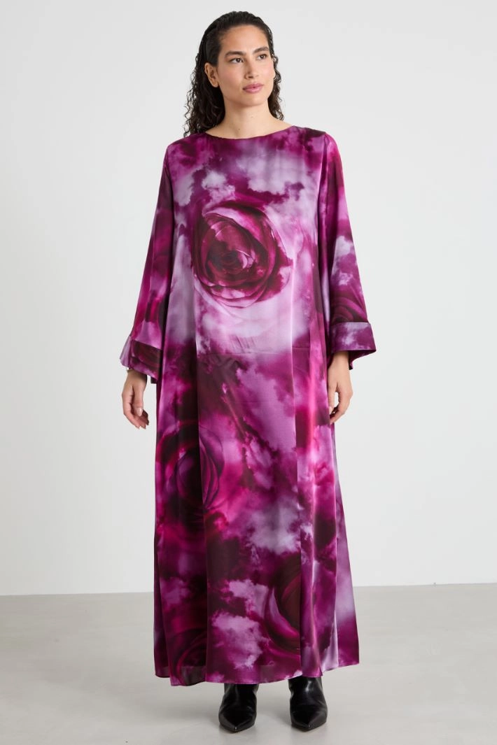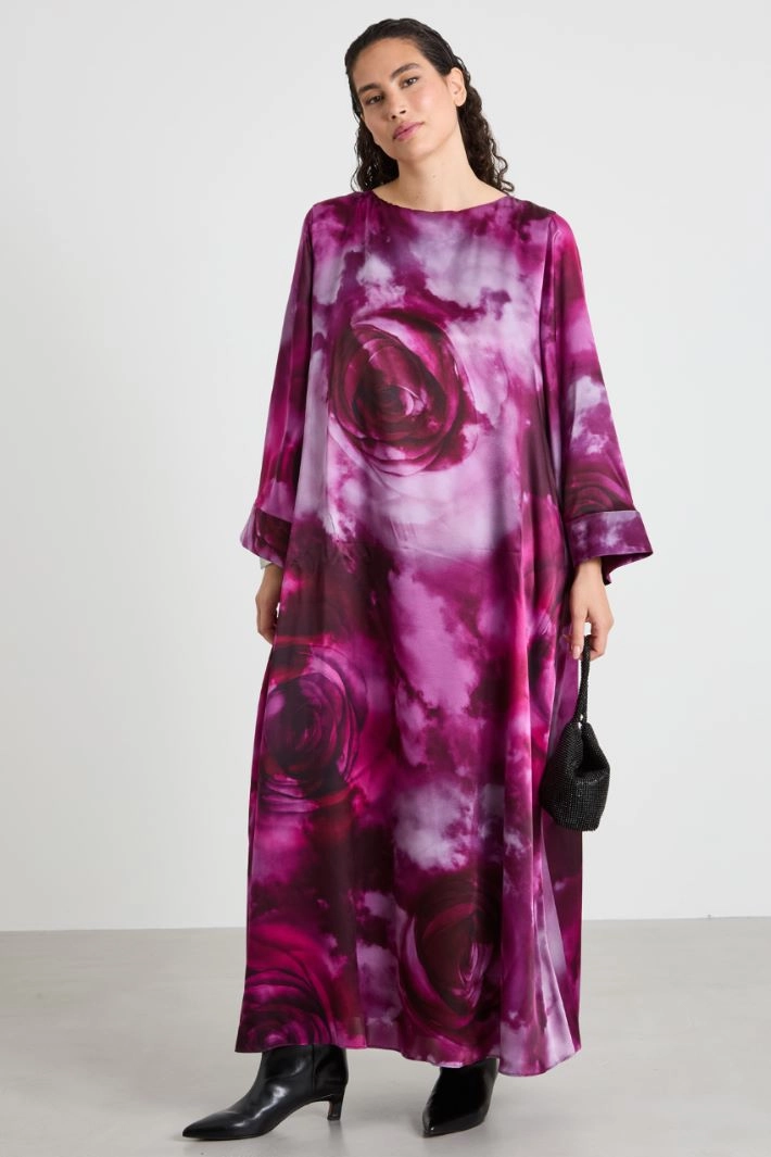 A-line dress in pure silk satin, featuring a boat neckline, long sleeves, and an invisible zip fastening at the back. Lined.