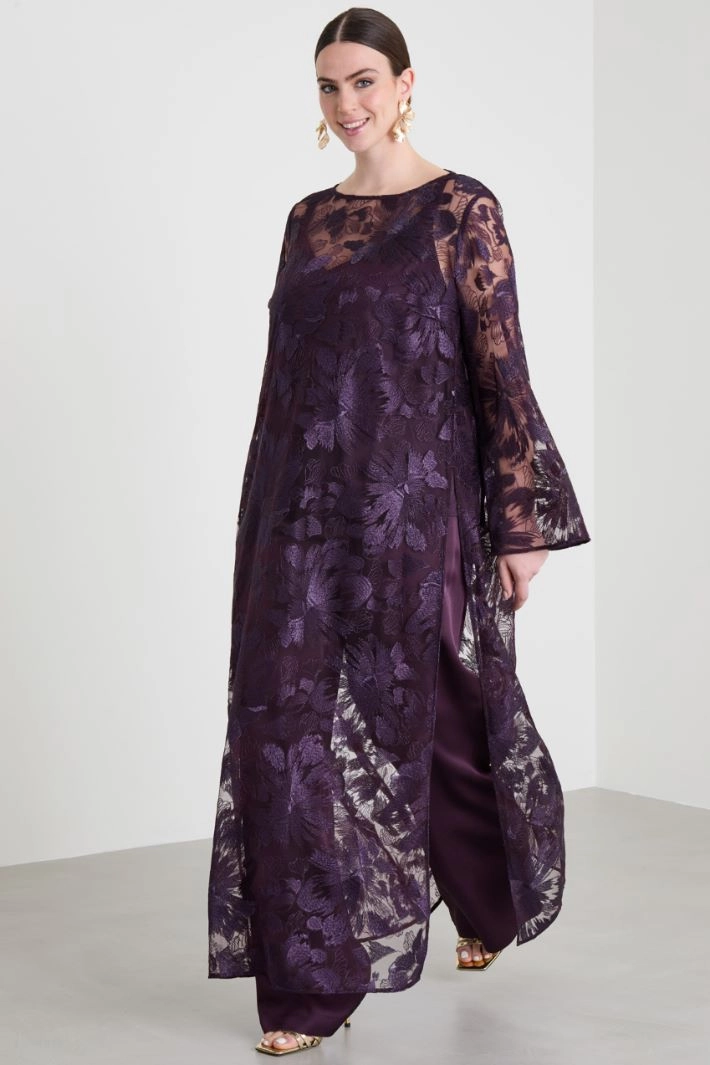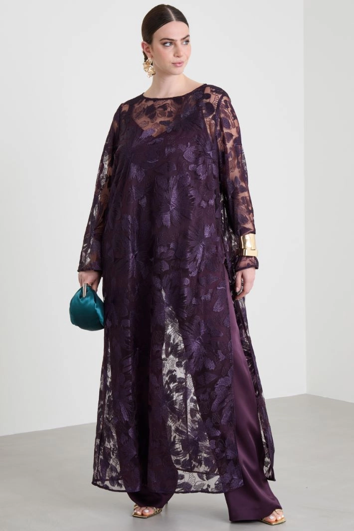 Long flared tunic in embroidered lamé tulle, with a boat neckline, long sleeves, wide side slit and teardrop fastening with a button on the back. Matching slip top.