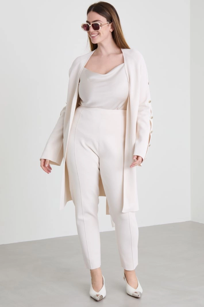 Cigarette trousers in stretch viscose blend yarn, with elasticated waistband and pleat sewn along the length.