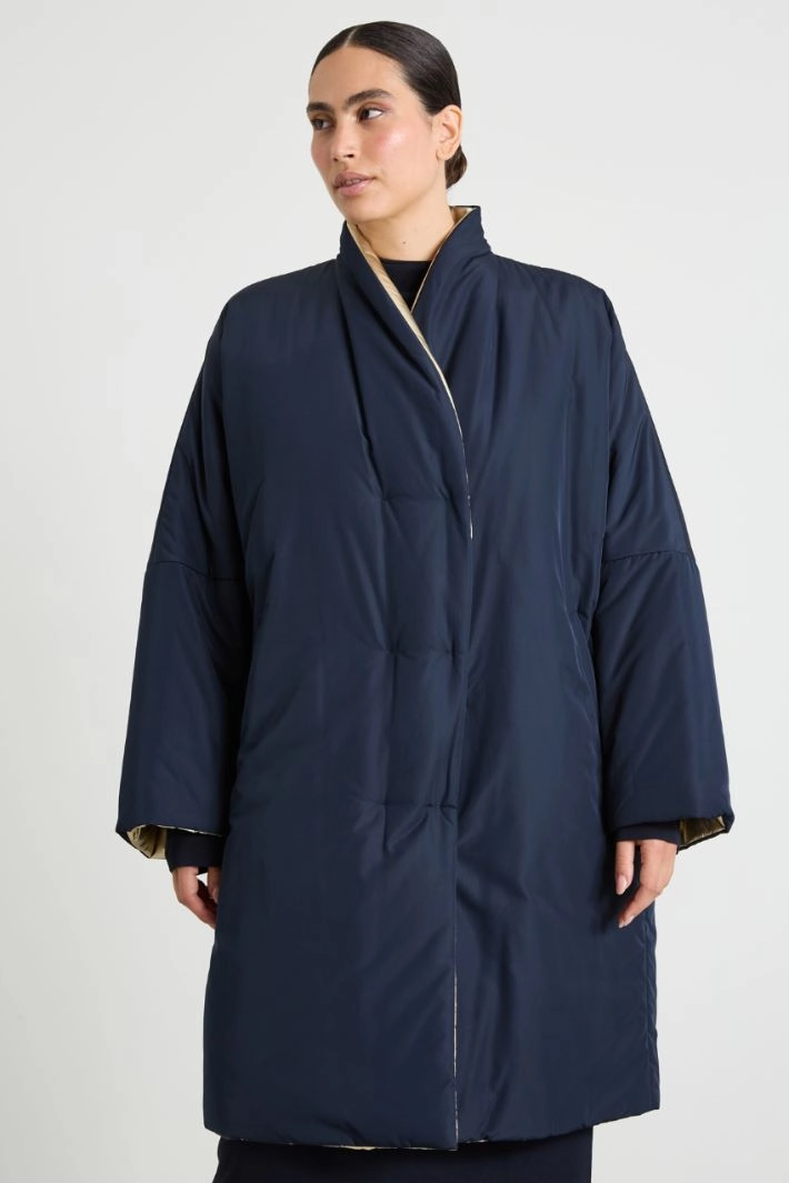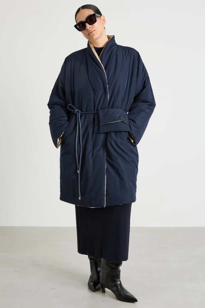 Long quilted straight-fit padded jacket in water-repellent technical fabric coated with a laminated finish, with a stand-up collar, long kimono sleeves, side pockets inserted in the seams with zips and double-breasted fastening with magnetic buttons. Tubular belt with matching pouch. Reversible model.