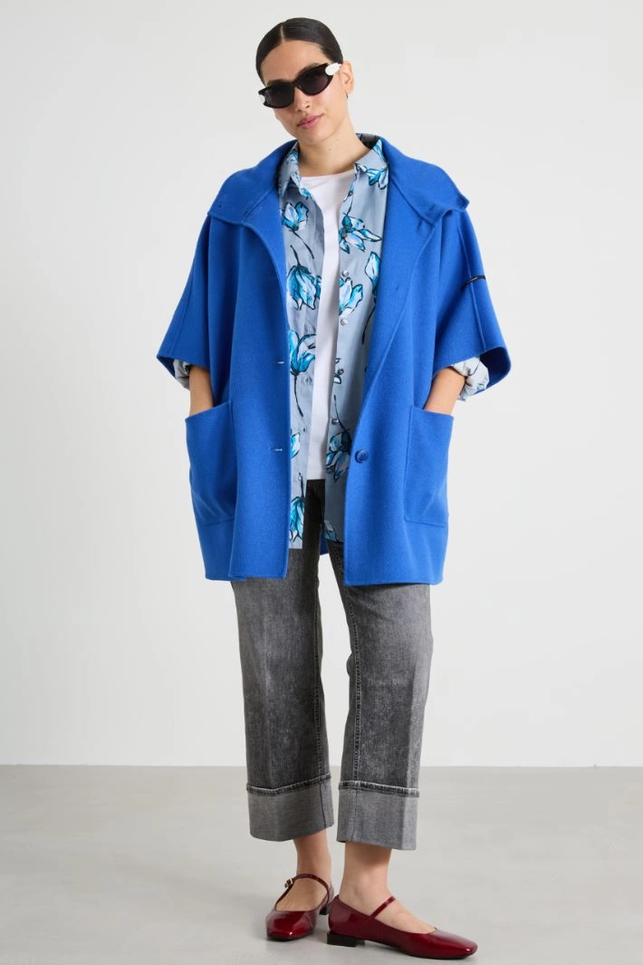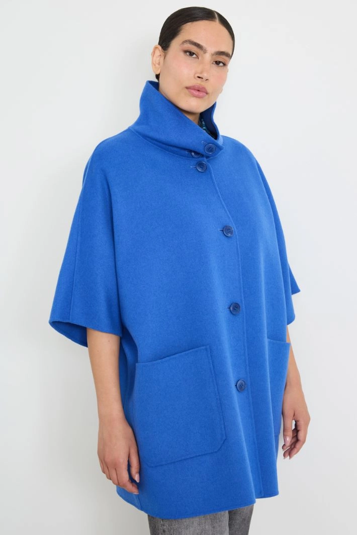 Straight-line cape in double wool blend fabric, with high collar, elbow-length kimono sleeves and patch pockets. Button fastening.