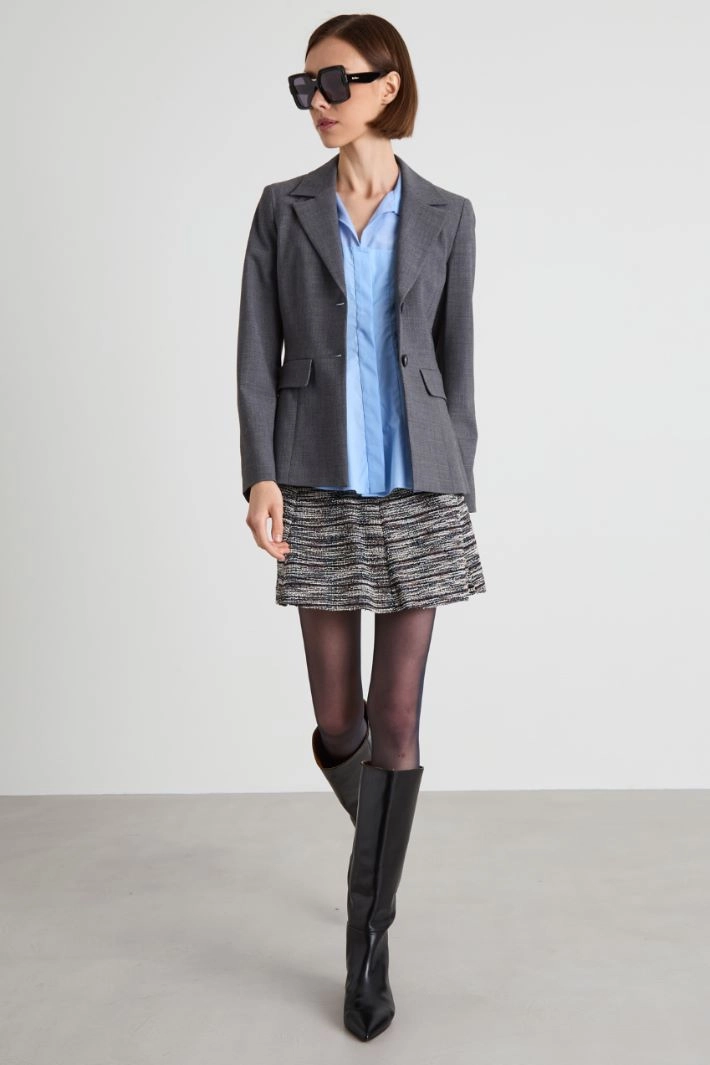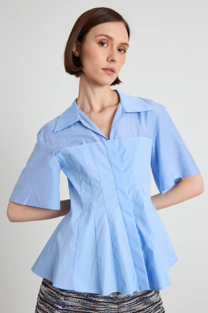 Bustier-cut shirt in pure cotton poplin, with silk-blend voile insert, classic V-neck collar, short sleeves and cut-out pattern. Hidden button fastening.