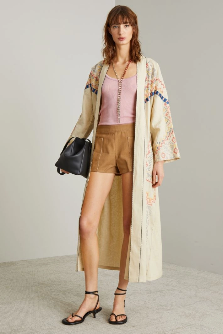 Long, straight-fit duster coat in pure linen canvas, with embroidered motif, V-neck, long dropped sleeves, patch pockets on the front and fastening with a matching belt.