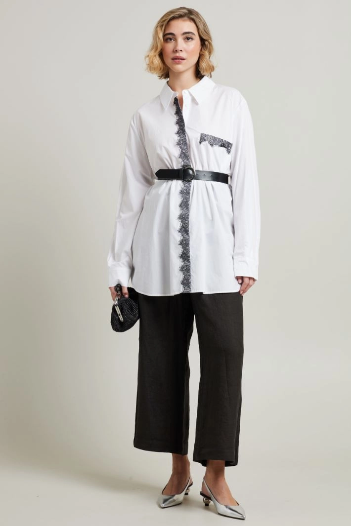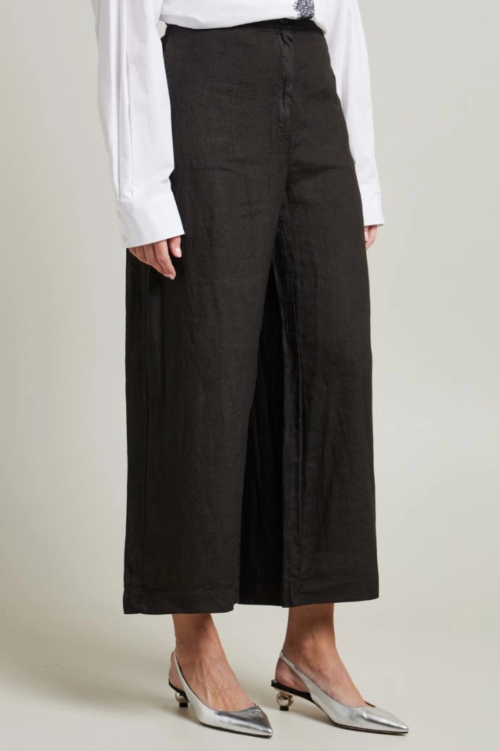 Straight-cut linen trousers with elastic waistband and French pockets. Zip and button fastening.