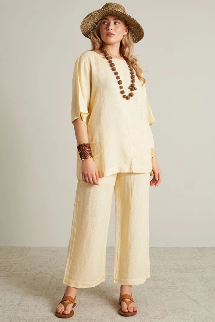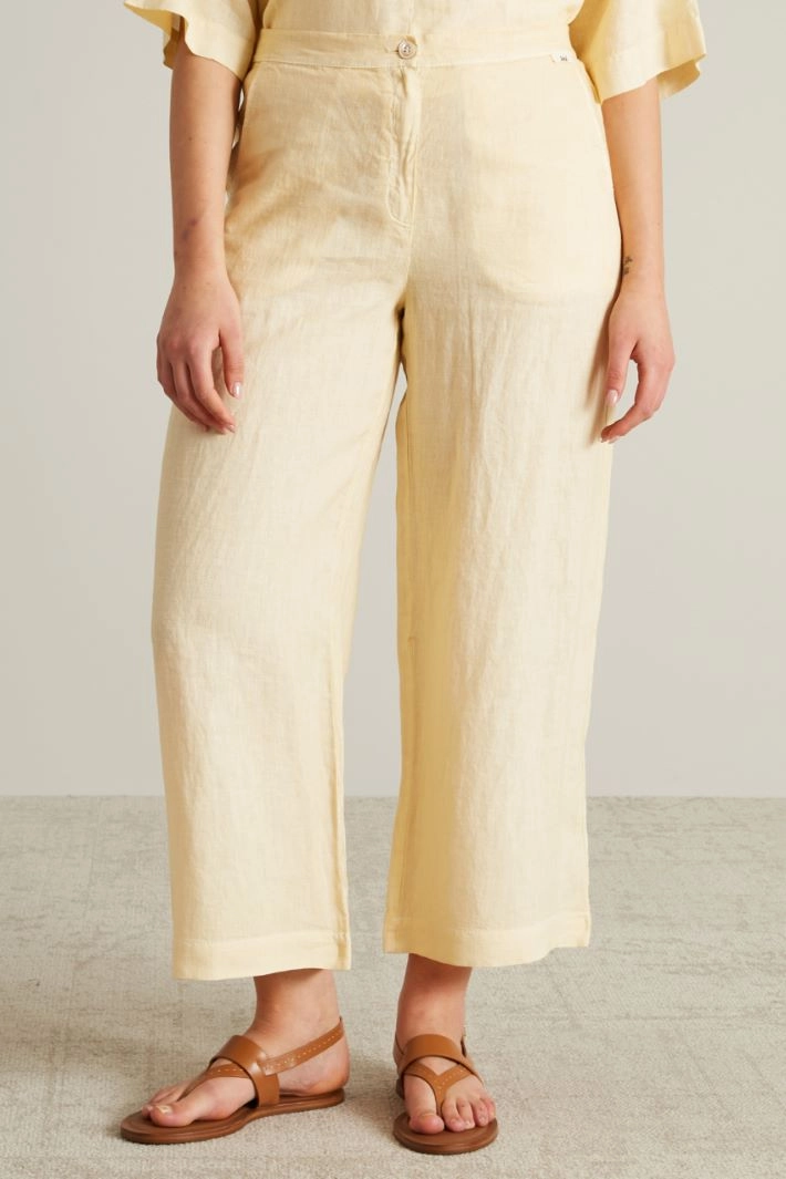 Straight-cut linen trousers with elastic waistband and French pockets. Zip and button fastening.