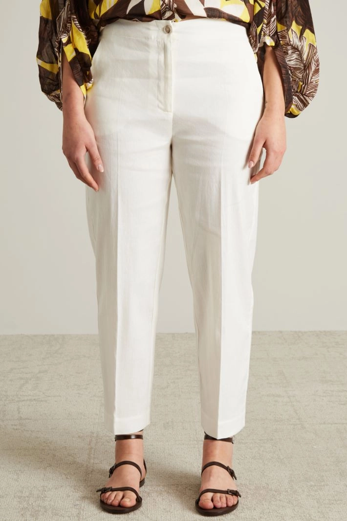 Straight-cut trousers in linen and cotton with elastic waistband and French pockets. Zip and button fastening.