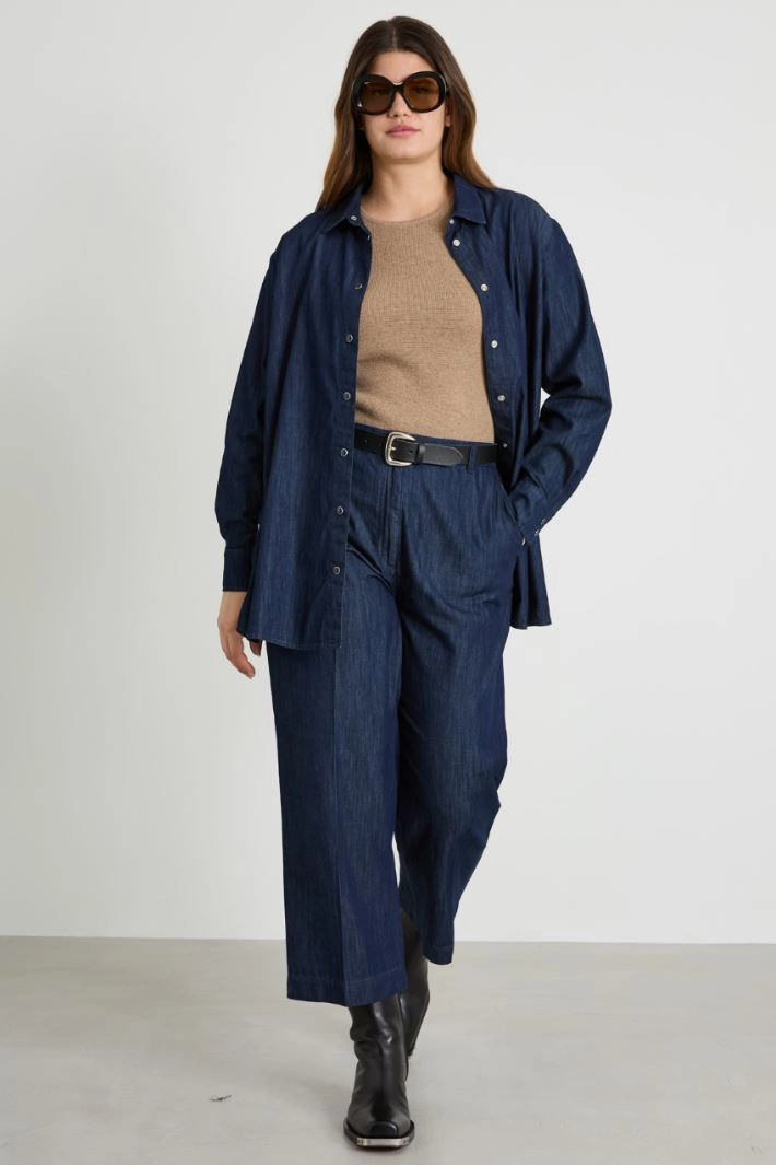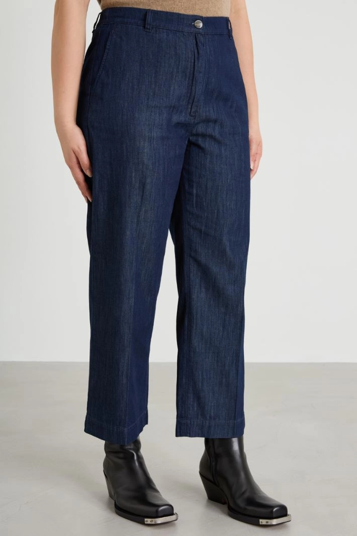 Straight-fit jeans in lightweight pure cotton denim, with elastic waistband insert on the back, belt loops, French pockets on the front, welt pockets on the back, pressed crease lengthwise. Zip and metal button fastening.