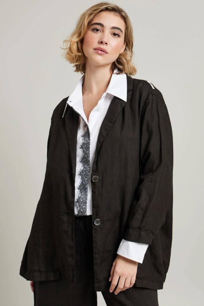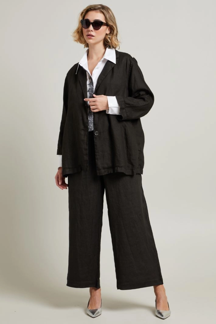 Loose-fitting linen tunic with lapel collar and long sleeves. Side pockets. Single-breasted button fastening.