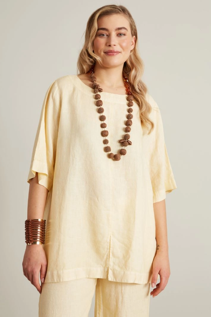 Loose-fitting linen blouse with a round neckline and short sleeves. Slit on the front.