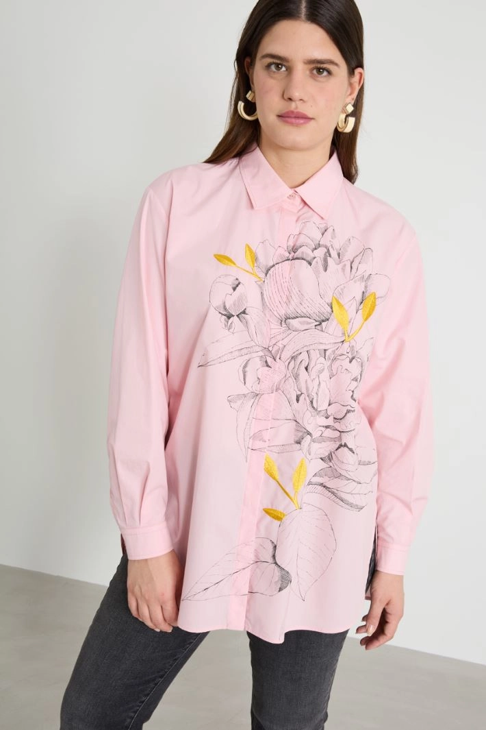 Straight-cut shirt in pure cotton poplin, with printed and embroidered motif, classic collar, long sleeves with cuffs and buttons, yoke cut with box pleat on the back and hidden button fastening.