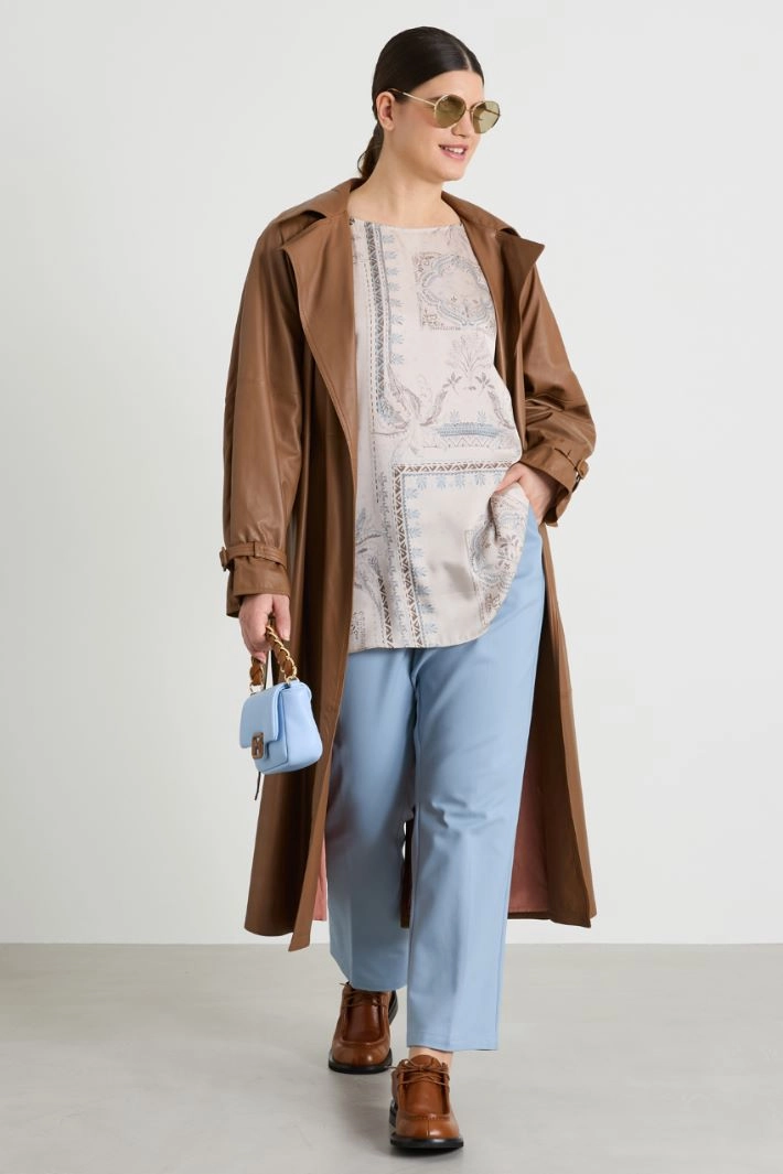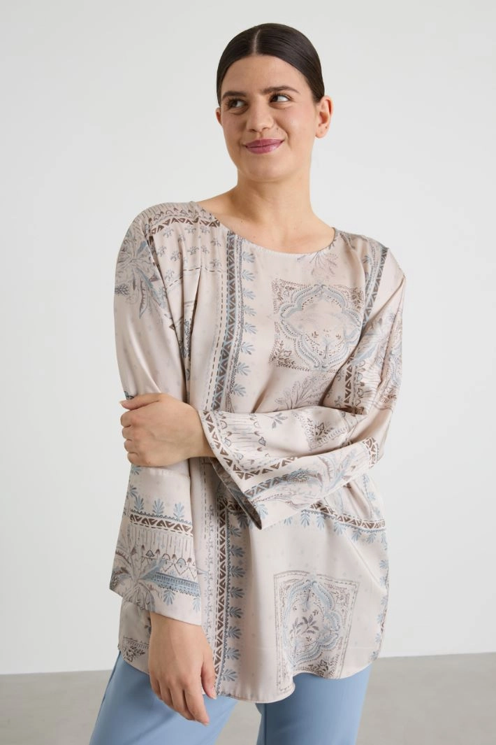 Oversized flared shirt in all-over printed twill, with rounded neckline and long kimono sleeves.