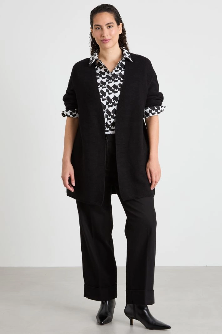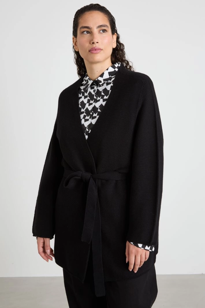 Straight-cut cardigan in pure cotton yarn, with raised knit, V-neck, long sleeves and fastening with a matching belt.