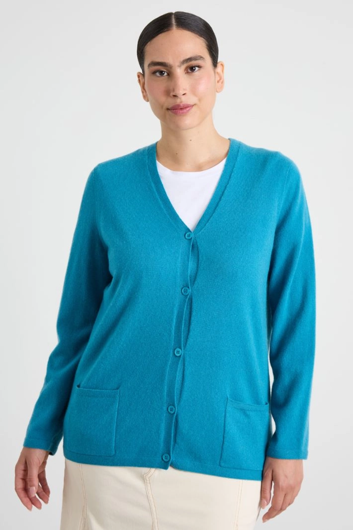Straight-cut cardigan in pure cashmere yarn, with a V-neck, long sleeves and patch pockets. Button fastening.