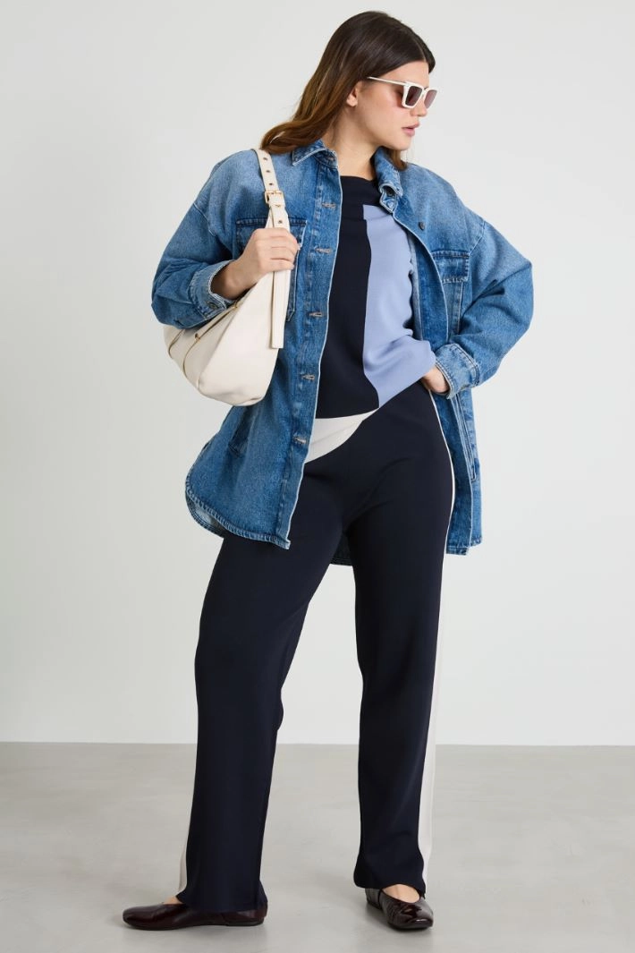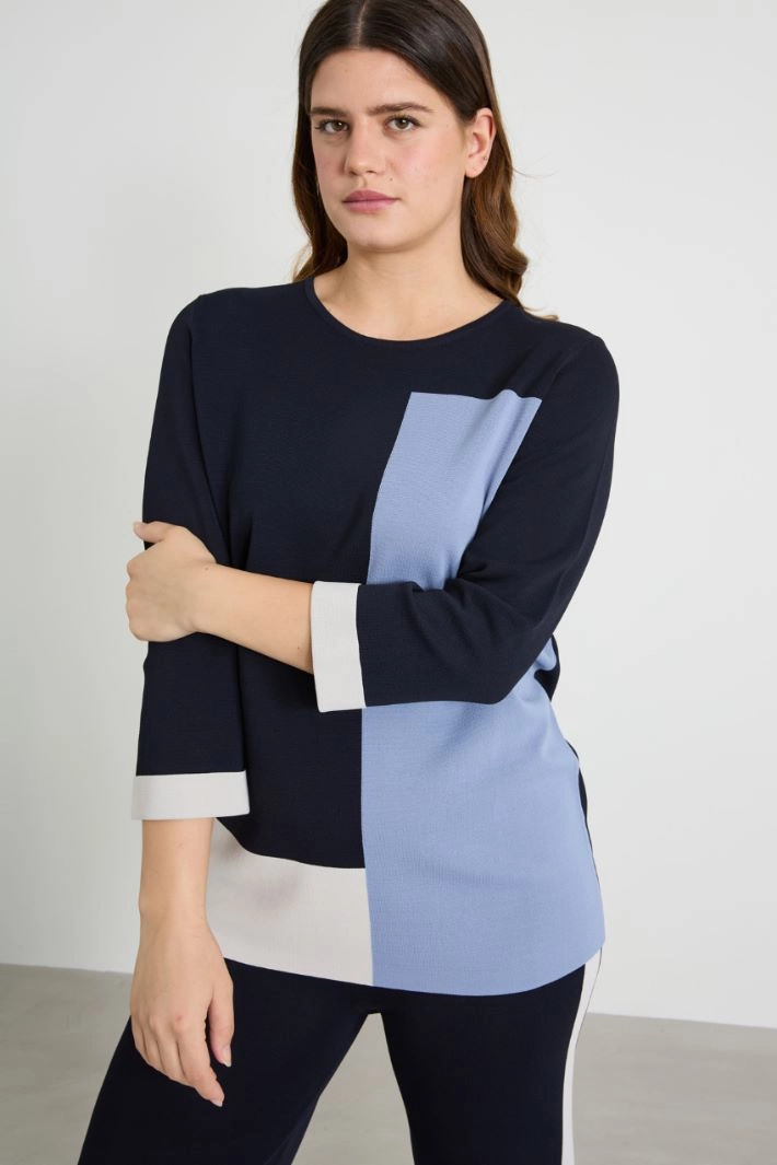 Straight-cut sweater in viscose blend crepe yarn, with inlay work, round neckline and three-quarter sleeves.