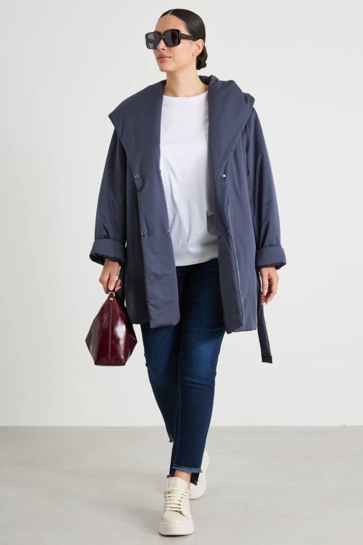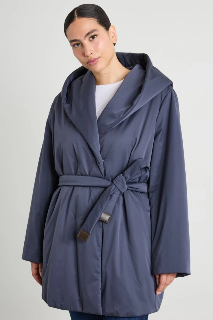 Padded, straight-fit coat in washed technical satin, with hood, long sleeves, side pockets with zip and double-breasted fastening hidden by buttons. Matching belt.