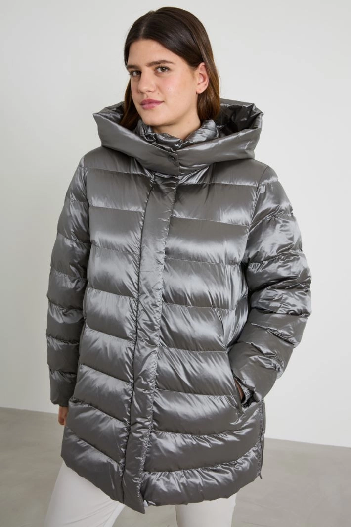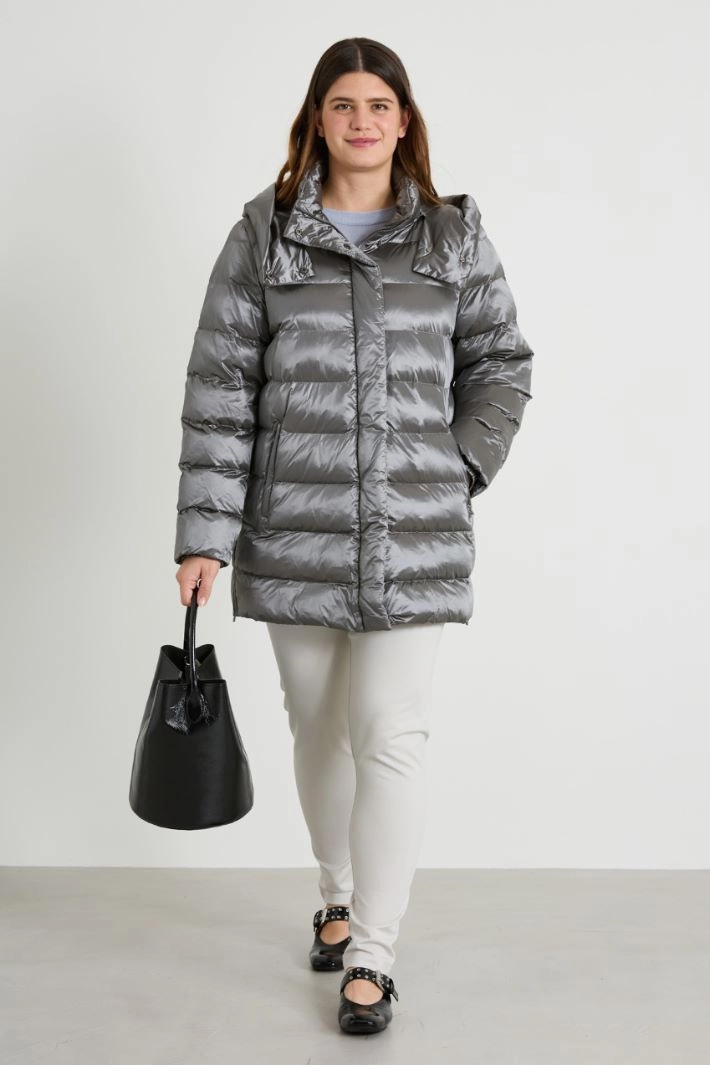 Padded, straight-fit jacket in quilted technical satin, with a high collar and removable hood, long sleeves, side welt pockets and side zip slits. Concealed fastening with double-slider zip and snap buttons.