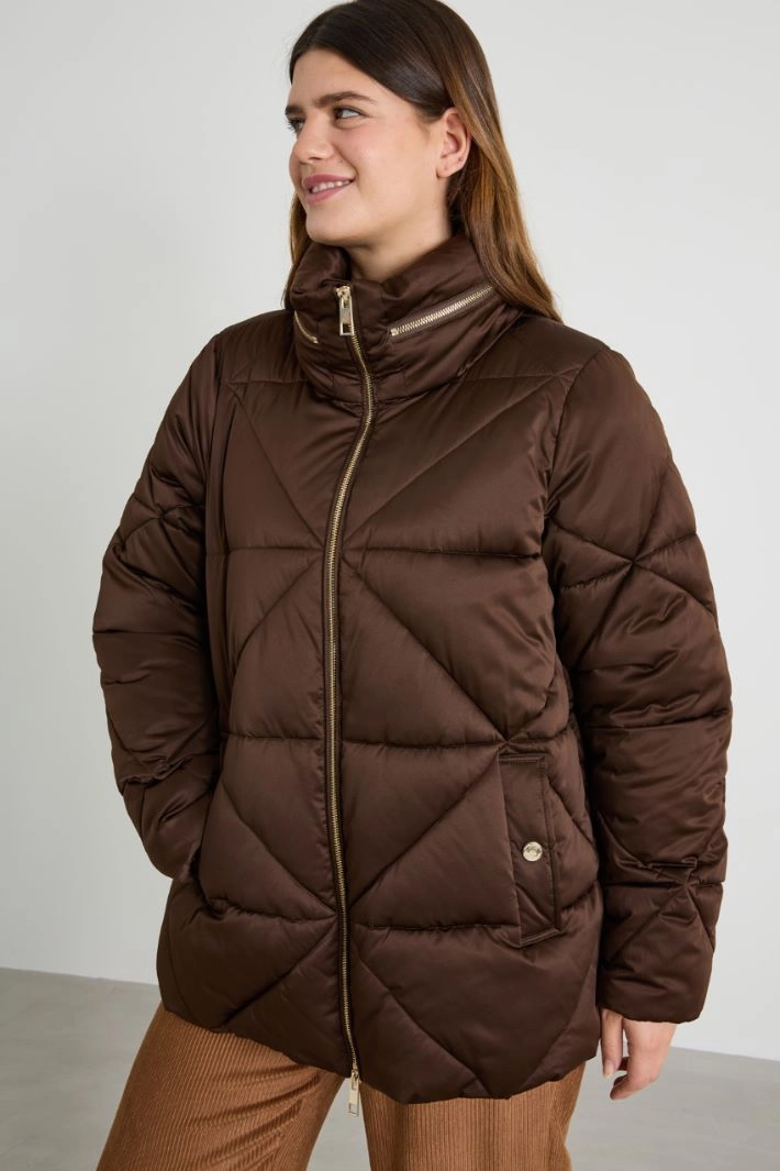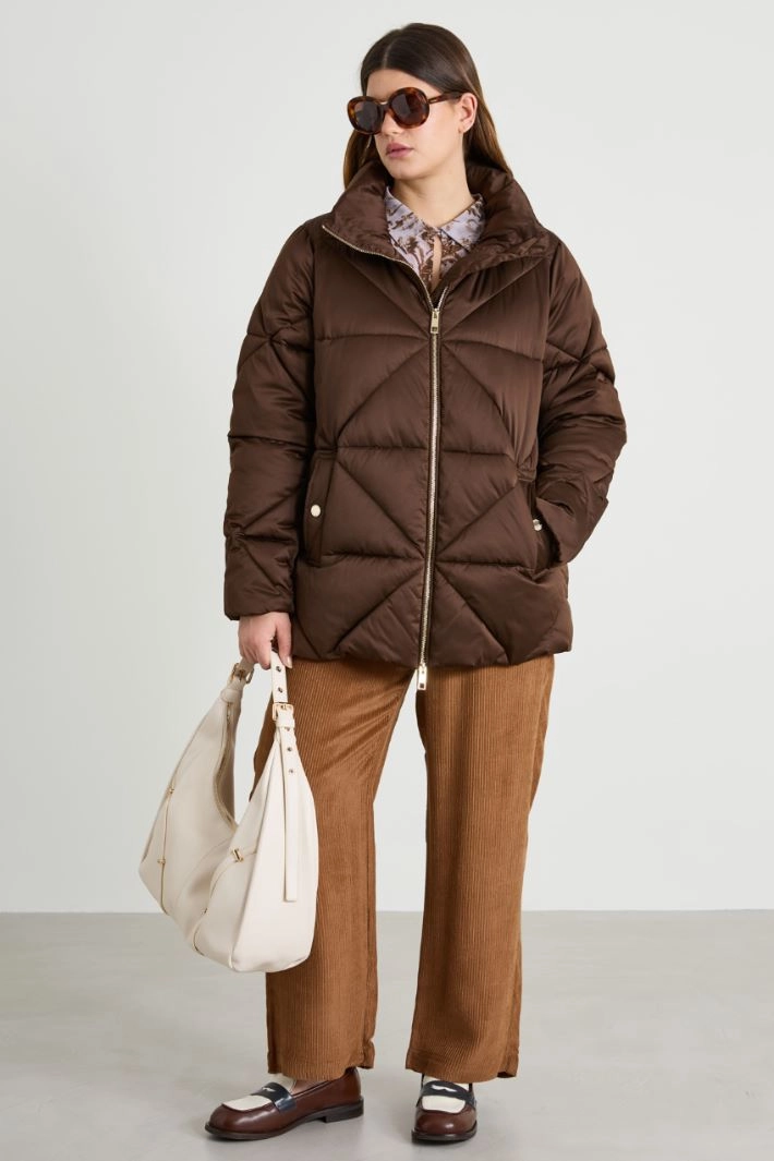 Flared padded jacket in quilted technical satin with a washed effect, with a high collar and pop-up hood, long sleeves and side welt pockets with button, double-slider zip fastening.