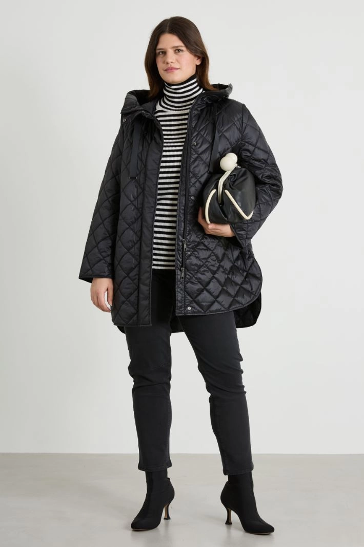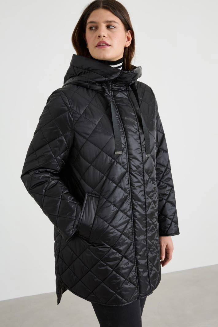 Padded with a straight fit in water-repellent technical satin, with hood and drawstring, long sleeves, welt pockets and asymmetrical hem. Hidden fastening with zip and press studs.