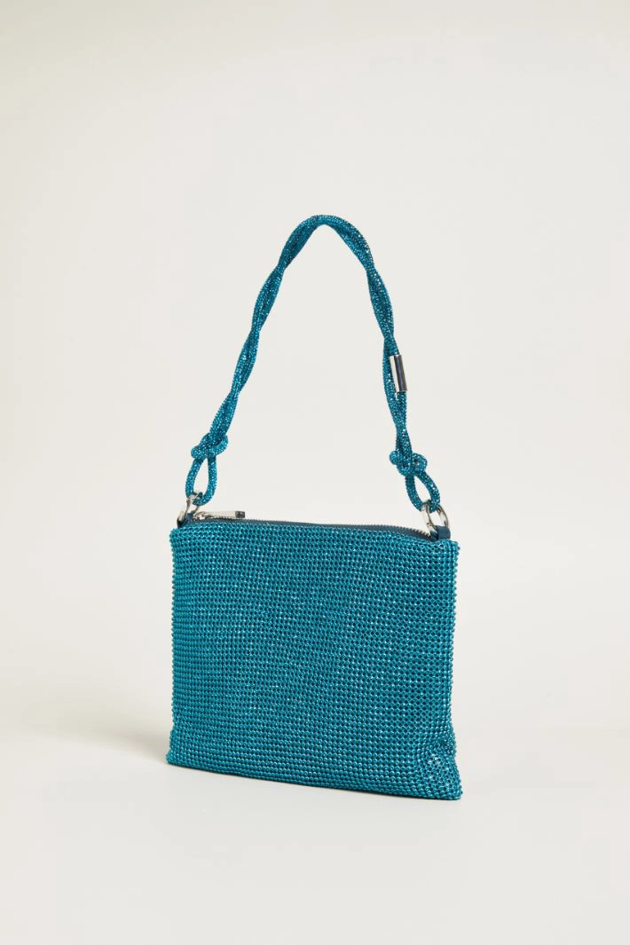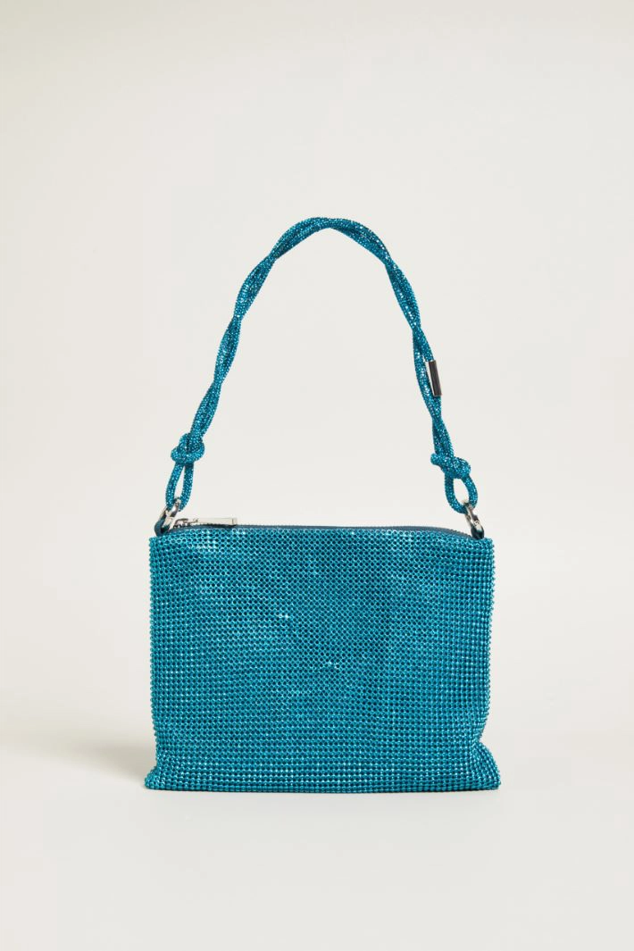 Handbag in fabric covered with a mesh of micro rhinestones, featuring a single tubular handle with a knot motif, an internal pocket and a zip closure. Lined interior.