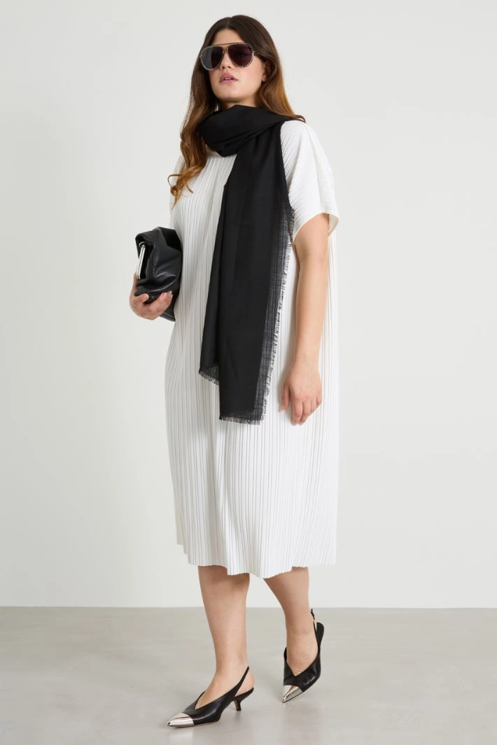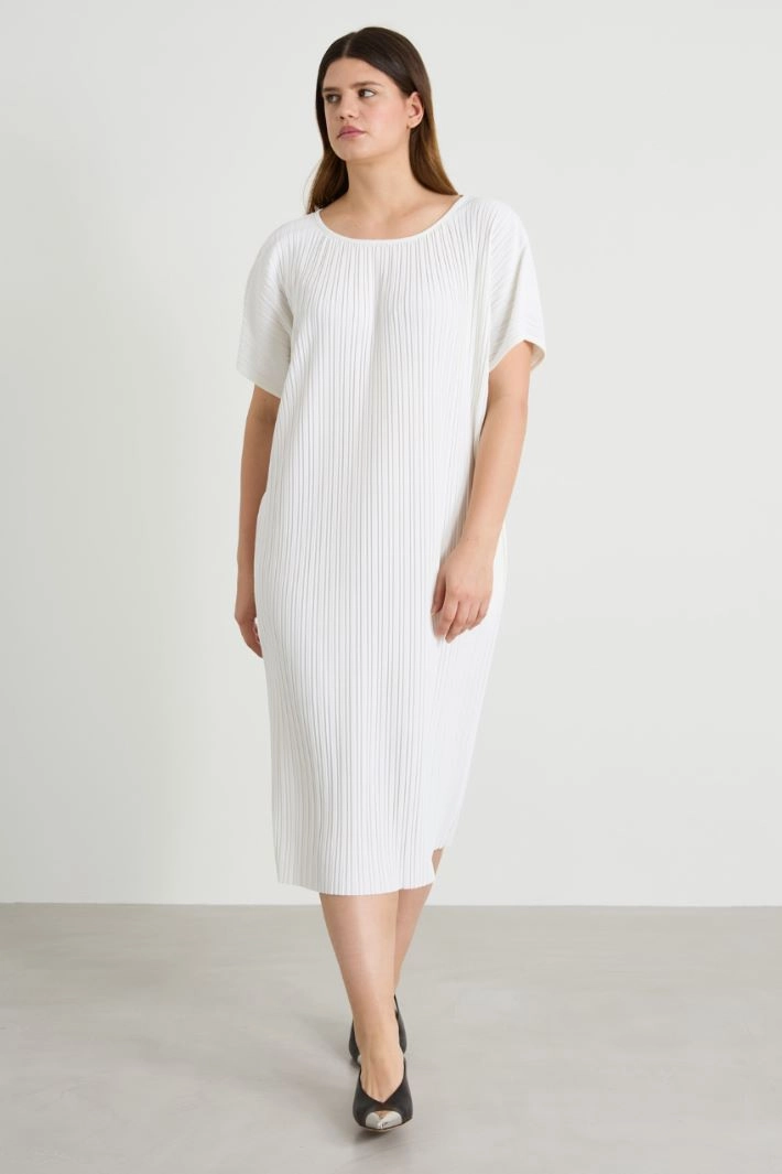 Straight-cut dress in pleated jersey, with a boat neckline, short kimono sleeves and inset pockets.