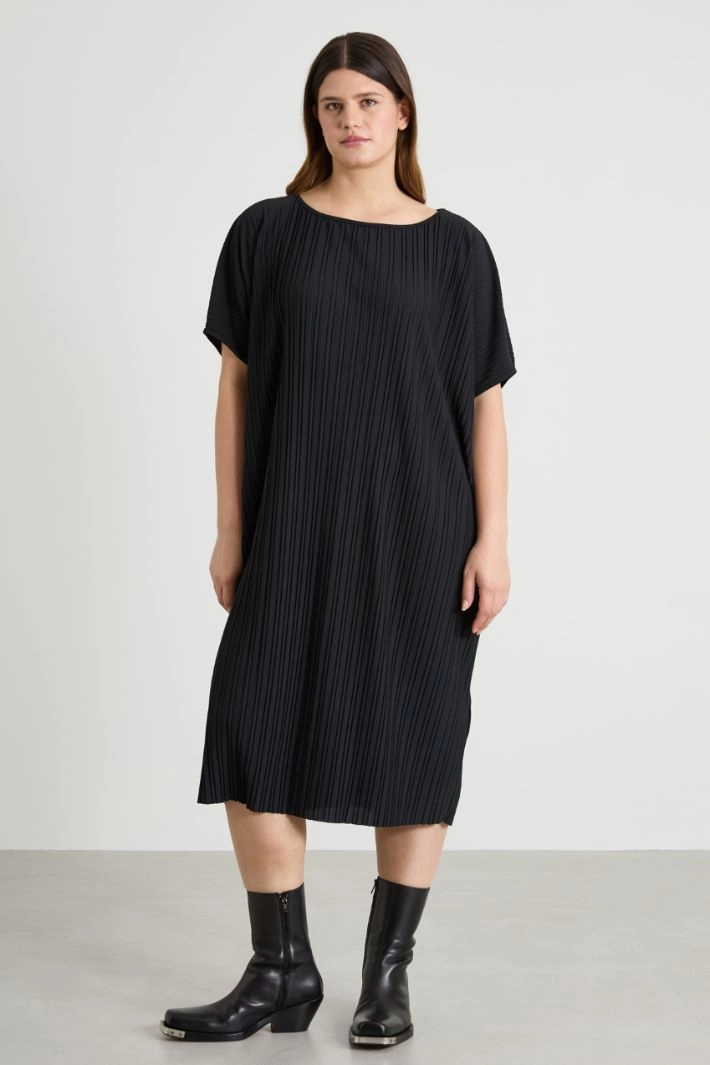 Straight-cut dress in pleated jersey, with a boat neckline, short kimono sleeves and inset pockets.