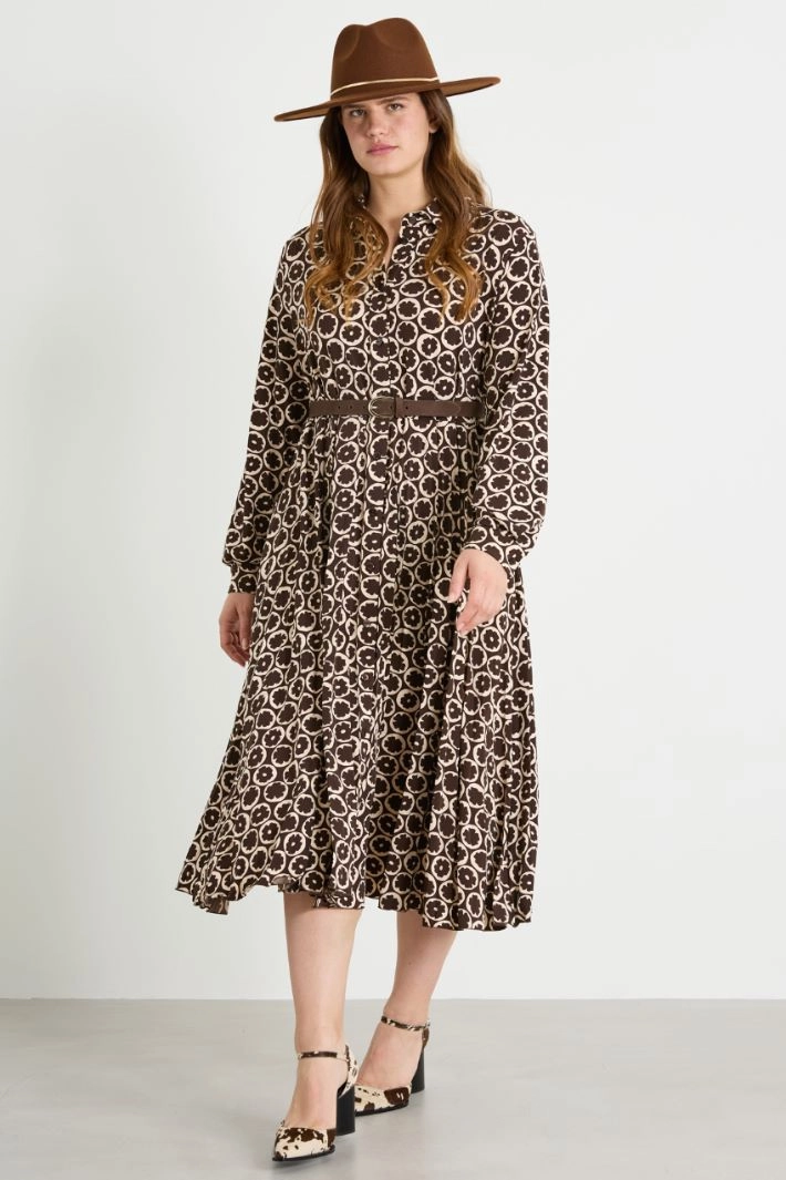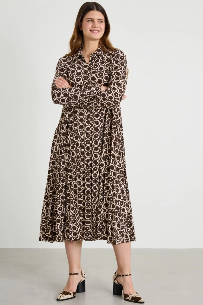Flared dress in all-over printed jersey, with shirt collar, long sleeves with cuff and button, and inset side pockets. Button fastening.