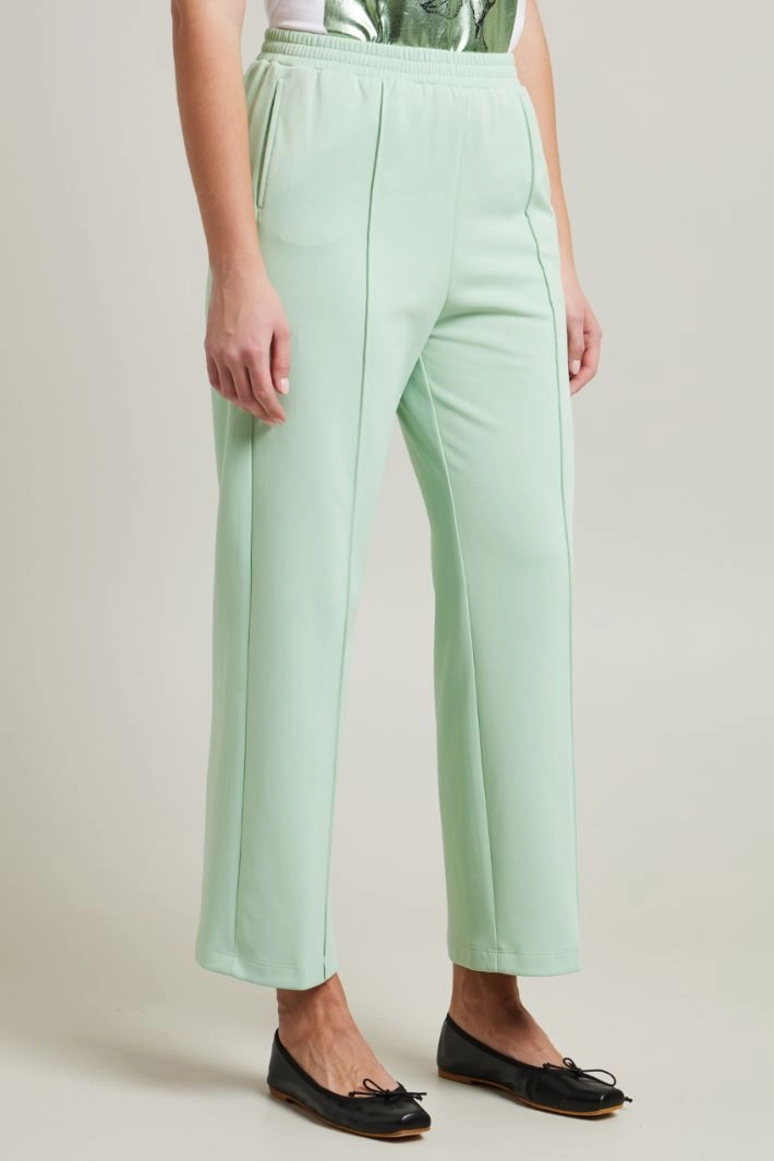 Loose-fitting trousers in cotton jersey, with elastic waistband and pressed pleat. French pockets.