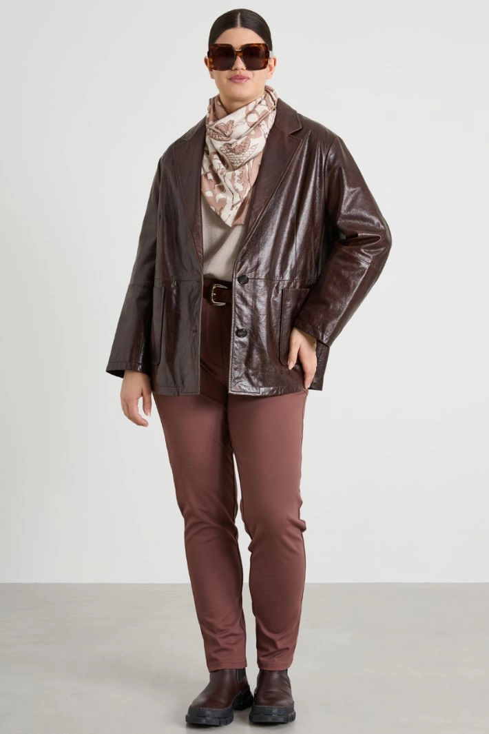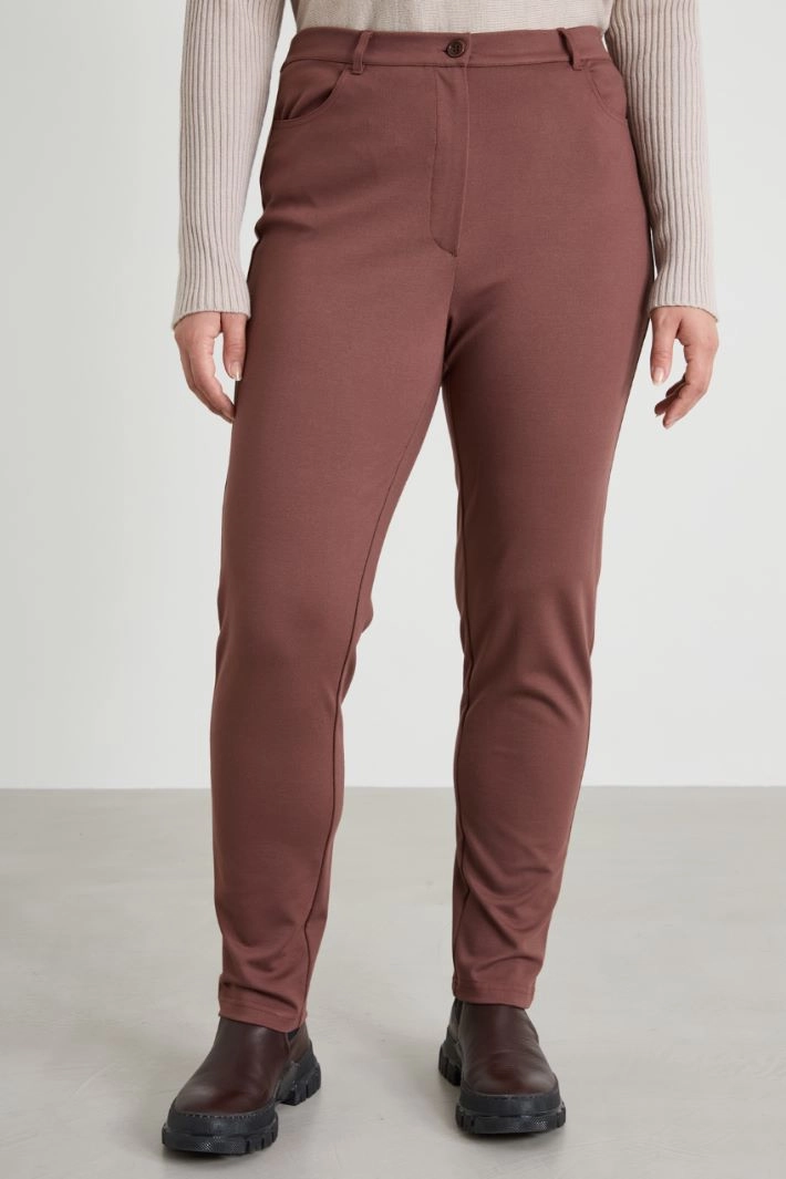 Slim trousers in stretch viscose blend jersey, with elastic waistband insert on the back, belt loops, French pockets on the front and patch pockets on the back. Zip and button fastening.