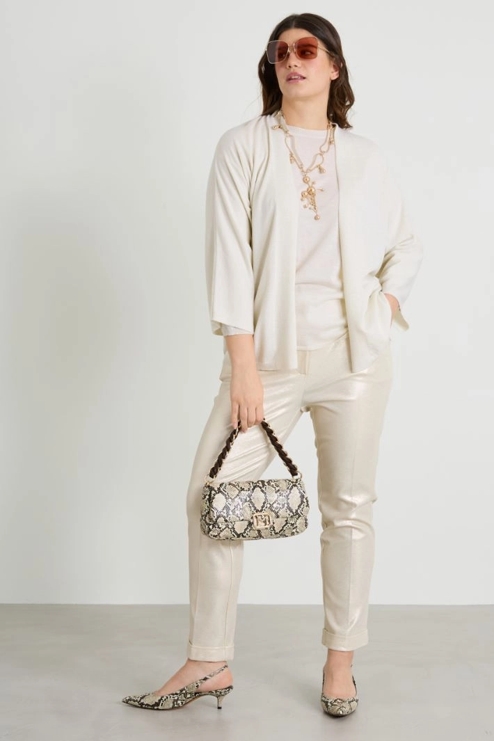 Slim trousers in stretch lamé viscose blend jersey, with elastic waistband, French pockets, crease along the length and turn-up at the bottom of the garment. Zip and button fastening.